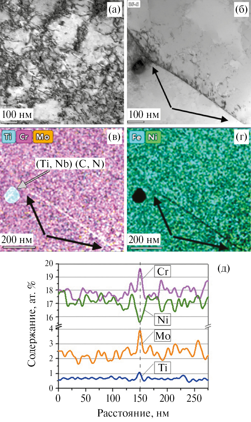 Рис. 1. Микроструктура стали Cr16–Ni19 х.д. в исходном (необлученном) состоянии: (а) ячеистая дислокационная структура; (б–г) сегрегации Cr, Mo, Ti на межзеренной границе (отмечена черными стрелками); (д) – профиль распределения Cr, Ni, Mo, Ti через границу зерен (штриховая линия).