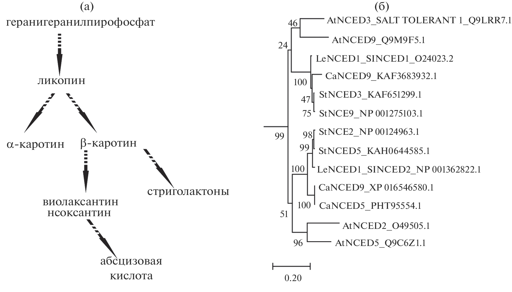 - Zhang M., Leng P., Zhang G., Li X. Cloning and functional analysis of 9-cis-epoxycarotenoid dioxygenase (NCED) genes encoding a key enzyme during abscisic acid biosynthesis from peach and grape fruits // J. Plant Physiol. 2009. V. 166. P. 1241. https://doi.org/10.1016/j.jplph.2009.01.013