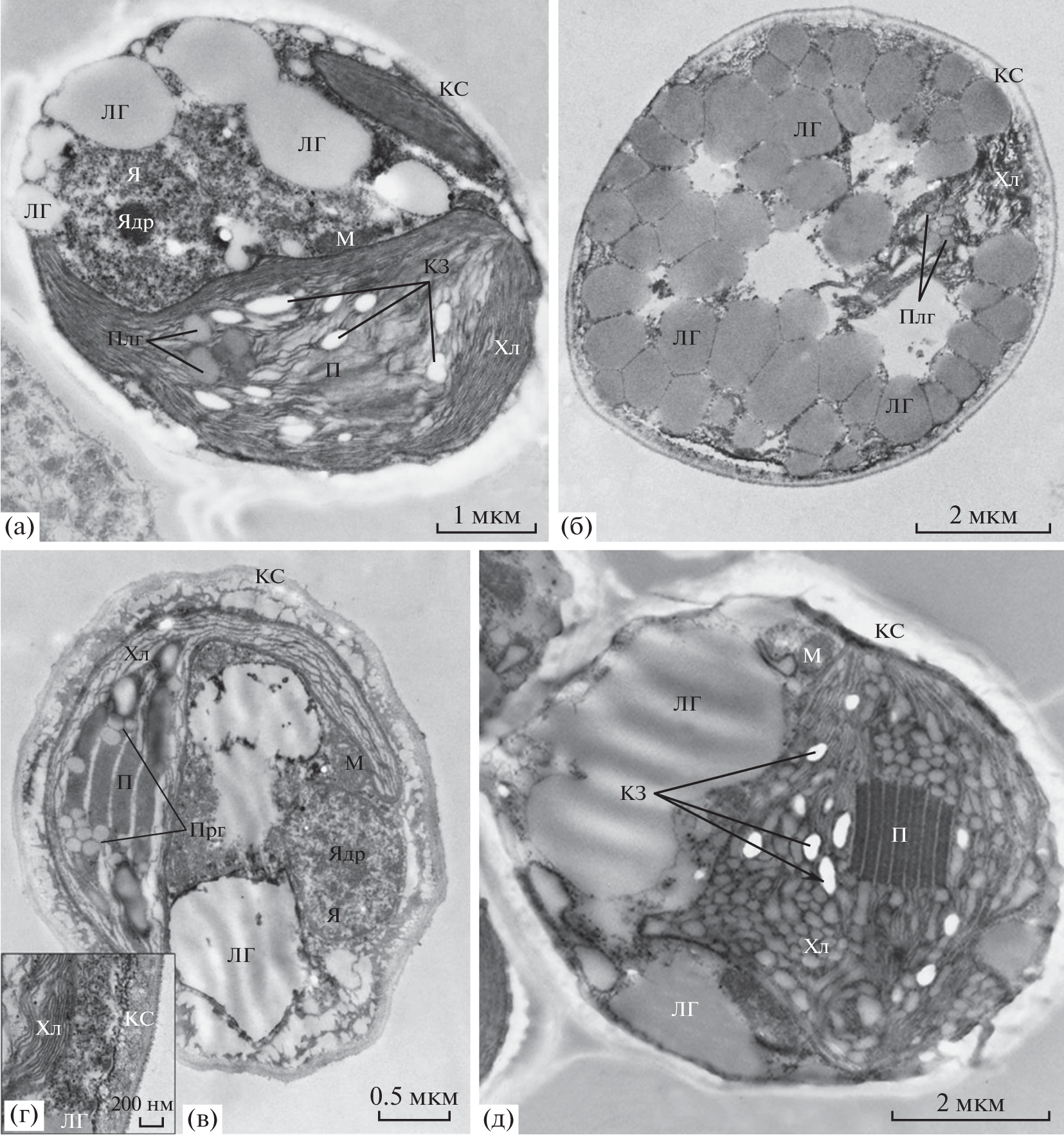 The effect of nitrogen starvation and, for the first time, low temperature, as well as their simultaneouseffect, on the physiology and ultrastructure of cells of microalgae of the genus Lobosphaera (Chlorophyta, Trebouxiophyceae) was studied. Nitrogen deficiency in both strains led to a decrease in the content ofchlorophyll by three times and an increase in the proportion of carotenoids by two times. A decrease in thecontent of both chlorophyll and carotenoids was observed at +10°C. The simultaneous effect of two factorsresulted in a threefold decrease in the chlorophyll content in NAMSU 924/2 and a sixfold decrease inNAMSU (CALU) 1497; the proportion of carotenoids in both strains decreased by 1.5–2 times. Data onultrastructural changes in cells of microalgae of the genus Lobosphaera under the influence of stress factorshave been obtained. A similar nature of the response in both strains to stress conditions was noted. Nitrogendeficiency led to the accumulation of numerous lipid droplets in the cytoplasm of cells along the cell wall. Long-term incubation on a nitrogen-free medium led to the filling of the entire volume of cells with lipiddroplets, disassembly of the membrane system of chloroplasts, that reduction in sizeand being locatedbetween densely lying lipid droplets. At low temperatures, the number of thylakoids decreased, while theinterthylakoid space and the size of chloroplasts increased. With simultaneous exposure to nitrogen starvation and low temperature, numerous lipid droplets accumulated, the number of thylakoids decreased, the interthylakoid space and the size of the chloroplast increased, which was noted under separate exposure to stress factors. The pyrenoid in both strains did not undergo significant changes in all cases.
