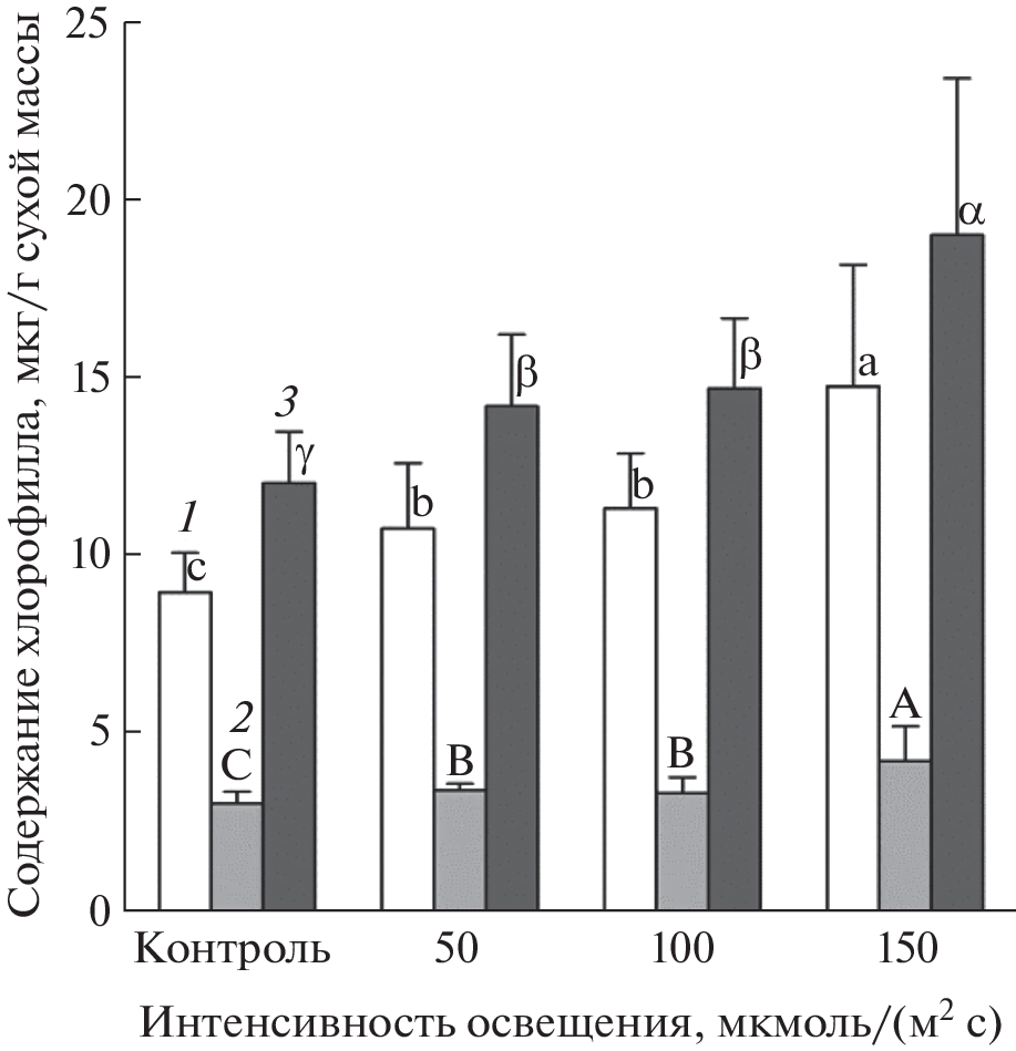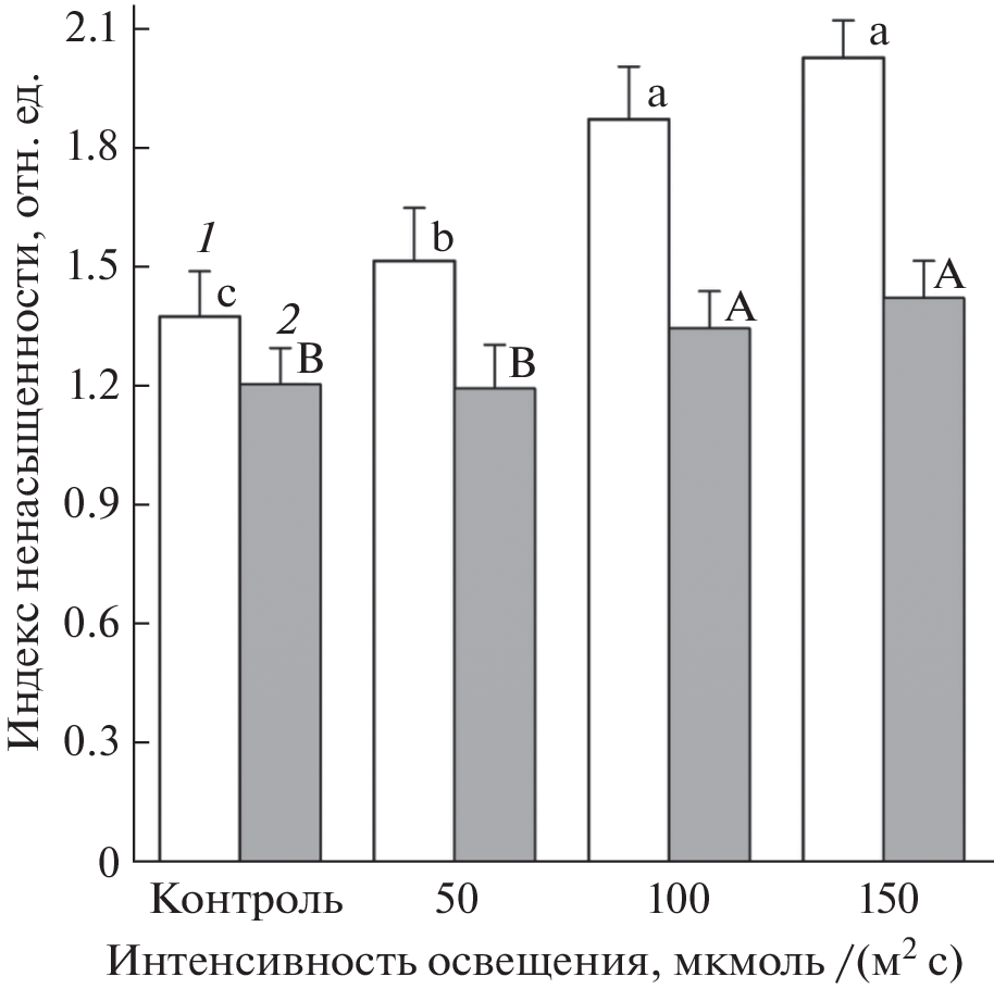 The vegetative organs of common basil (Ocimum basilicum L.) grown in water culture at different levels of illumination (50, 100, and 150 μmol PAR quanta/(m2 s)) for 21 days were studied. In the work, the Purple Velvet basil variety, which is popular in agriculture and has intensely colored leaves was used. The biomass, water content, and composition of fatty acids (FA) of total lipids in the leaves and roots of plants and the content of malondialdehyde and chlorophylls (a, b) in the aerial parts of plants were determined. The sensitivity of the FA composition and morphophysiological parameters (biomass and chlorophyll content in leaves) of O. basilicum plants to the intensity of illumination was shown. The greatest effect was caused by the illumination intensity mode of 150 μmol/(m2 s). Species composition of O. basilicum FA under all lighting conditions was wider in root lipids; however, more pronounced changes in the qualitative composition of Fas were observed in leaves. Photodependent regulation of FA component composition of O. basilicum manifested itself in an increase in the proportion of unsaturated FAs, especially polyene ones, which led to an increase in the unsaturation index (UI) of esterified lipid FAs. The highest UI values were obtained with illumination of 150 μmol/(m2 s). At the same time, with an increase in the illumination intensity, a significant increase in the activity of ω-3 and ω-9-desaturases occurred, which indicates in favor of their lightdependent activation. Thus, increasing the intensity of lighting to certain values directly proportionally affects the physiological parameters of O. basilicum. The maximum indicators of productive growth and the implementation of adaptive mechanisms of green and underground parts of basil plants correspond to illumination of 150 μmol/(m2 s).