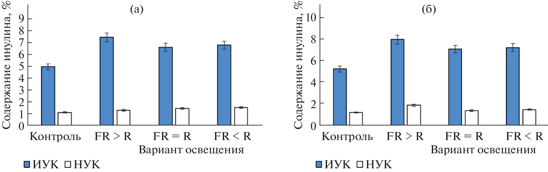 In vitro callus cultures of common chicory (Cichorium intybus L.) were obtained and their growth and biochemical characteristics depending on the hormonal composition of the MS medium and the spectral composition of light were studied. The study of the effect of light culture on callus tissue formation and inulin accumulation in it was carried out in opaque grow tents with radiation aligned with the flux density of pho- tosynthetic photons and different ratios of its levels in the region of 660 nm (R, red) and 730 nm (FR, far red). The control variant was placed under white linear fluorescent lamps. The resulting cultures were character- ized by high proliferative activity and the capability for morphogenesis. It has been established that the inter- action of two factors—the presence of auxins in the nutrient medium (IAA or NAA at a concentration of 7.5 mg/L in combination with BAP 0.5 mg/L) and cultivation under light culture conditions (FR > R, FR = R, FR < R)—had a significant impact on the biosynthetic potential of cell cultures. In the obtained cultures, a study of the quantitative content of inulin was carried out. It has been shown that the high content of inulin (7.55–7.95%) in callus cultures was on the MS medium in combination with IAA at FR > R illumination. This is probably due to the fact that well proliferating and highly morphogenic callus tissue was formed under these conditions. The obtained results confirm the hypothesis about the specificity of cultured cells to in vitro synthesize and accumulate secondary metabolites in dedifferentiated cells and the dependence of this process on factors of chemical and physical nature.