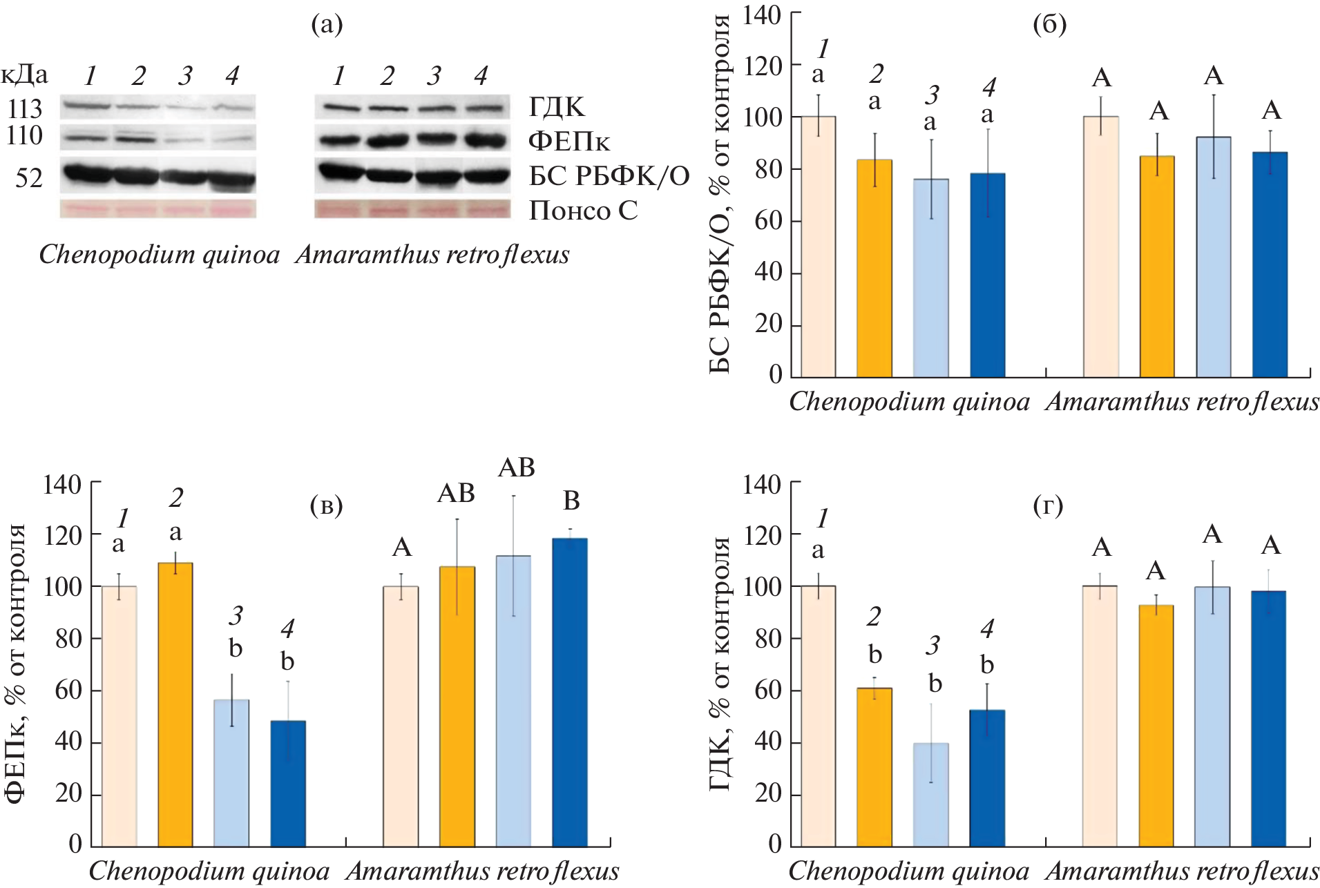 The thermal stability of plants with different types of photosynthesis Chenopodium quinoa Willd. (C3) and Amaranthus retroflexus L. (C4-NAD) to short-term elevated temperature (35°С, eT) at ambient (400 ppm, aCO2) and elevated (800 ppm, eCO2) CO2 concentration was investigated. Growth parameters, water, proline, and MDA content, CO2/H2О gas exchange parameters, the functioning of PS I and PS II, and the content of key photosynthetic (Rubisco, PEPC) and photorespiratory (GDC) enzymes were analyzed. Under control conditions, C4-type plants, compared with the C3-type, show higher values of dry biomass growth, intensity of visible photosynthesis, transpiration, and PS I activity and lower proline content. The photosynthetic and stomatal apparatus of both types was sensitive to eT, which manifested itself in a decrease in the intensity of apparent photosynthesis and transpiration. In addition, suppression of light reactions (PS II) and intensity of photorespiration (according to GDC) was observed in the C3-species and an increase in the content of proline in the C4-species. Under eCO2 conditions, the C3-species showed a decrease in the intensity of photorespiration, while oxidative stress (twofold increase in the content of MDA) was accompanied by reduced intensity of apparent photosynthesis, transpiration, and increased intensity of dark mitochondrial respiration in the C4-species. A softening effect of eCO2 on thermal stability data for C3- and C4-plants was not established. With the combined action of eCO2 and eT, both types exhibited oxidative stress, reduced efficiency of PS II and apparent photosynthesis, and activation of dark respiration. However, differences were also observed: oxidative stress was accompanied by a decrease in the increase in dry biomass and water content in tissues, as well as suppression of photorespiration, in the C3-species, while there was a decrease in the intensity of transpiration and an increase in the content of PEPC in the C4-species. Reduced WUE with combined action of eCO2 and eT in plants of the C4-species was less significant than the C3-species. The different response of quinoa plants (C3) and amaranth (C4) on the combined effect of climatic factors of elevated temperature and CO2 concentration is discussed.