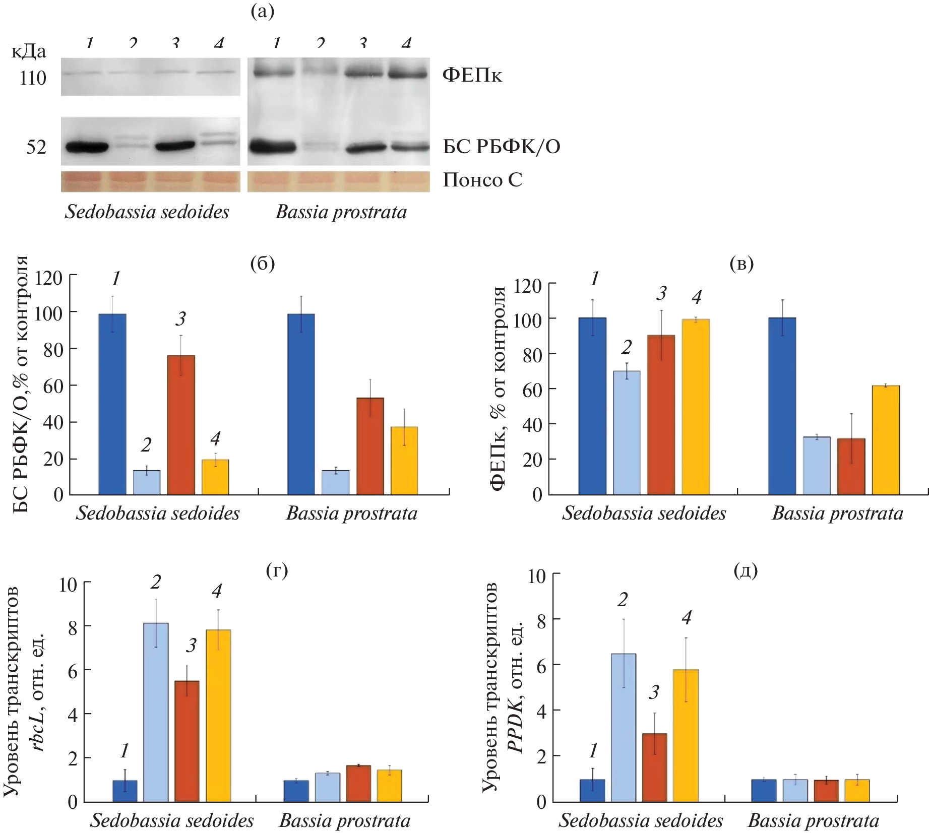 The effect of drought on the morphophysiological, biochemical, and molecular genetic parameters of plants Sedobassia sedoides (Pall.) Freitag & G. Kadereit with an intermediate C3–C4-type of photosynthesis and Bassia prostrata (L.) A.J. Scott with a C4-NADP type of photosynthesis grown at different temperatures (25 and 30°C) was studied. A decrease in the biomass, water content, and effective quantum yield (ΦPSII) of PSII, as well as an increase in the expression of the psbA gene encoding the PSII D1 protein under the action of drought, was observed in both species regardless of the growing temperature. Both species showed a decrease in the content of photosynthetic enzymes ribulose-1,5-bisphosphate carboxylase/oxygenase (Rubisco) and phosphoenolpyruvate carboxylase (PEPC) under drought conditions at 25°С, which was accompanied by a significant increase in the expression of the rbcL and PPDK genes in S. sedoides. Acclimation of S. sedoides plants to elevated temperatures led to an increase in the activity of cyclic electron transport around PSI, to mitigation of the negative effect of drought on the light reactions of photosynthesis (reduction in NPQ) and the content of the PEPC enzyme, as well as to a shift in the ionic balance caused by a decrease in the potassium content. B. prostrata showed greater drought resistance and was characterized by greater thermolability of photosynthetic enzymes, changes in the content and ratio of which allowed this species to maintain growth in drought conditions at different temperatures.