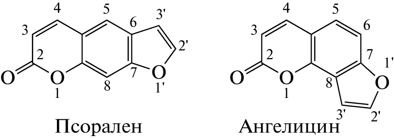 benzene, and furan rings, possessing a system of conjugated double bonds (which in some cases can be disrupted). This group of compounds is currently being widely studied due to its phototoxic and medicinal properties. The work examines furanocoumarins of natural origin, identified in the family Umbelliferae, or Apiaceae, their diversity is structured; the history of their study, the currently known stages of their biosynthesis,