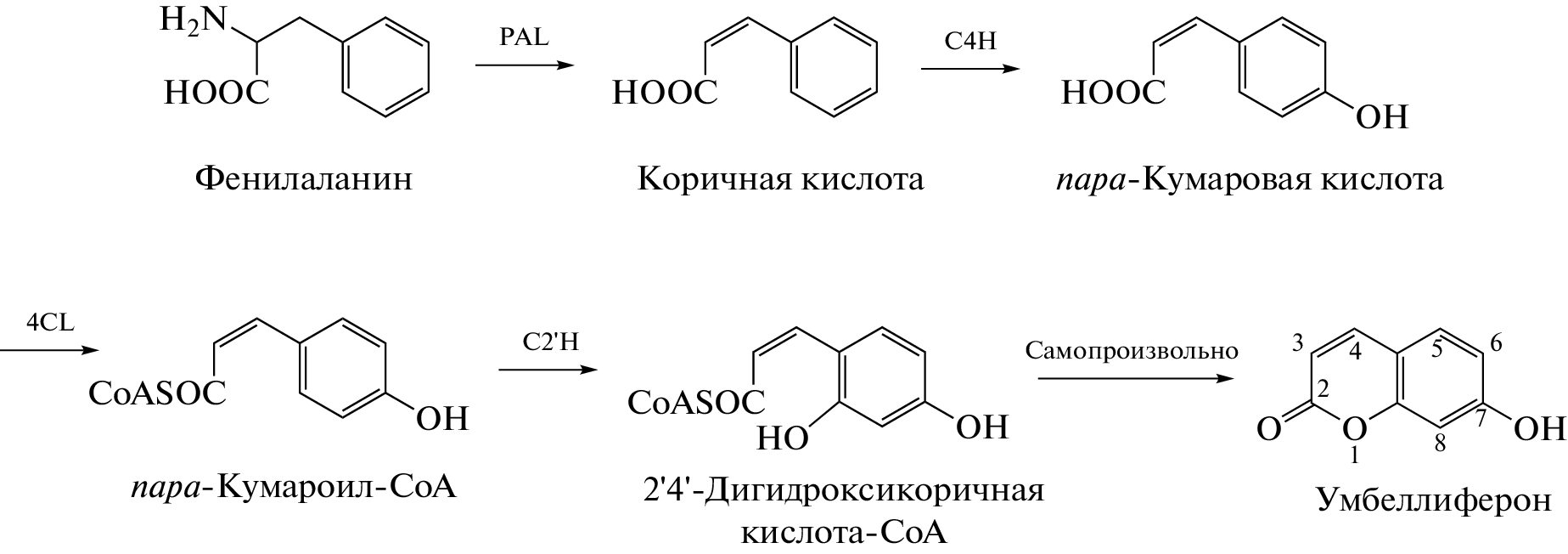 - Sui Z., Luo J., Yao R., Huang C., Zhao Y., Kong L. Functional characterization and correlation analysis of phenylalanine ammonia-lyase (PAL) in coumarin biosynthesis from Peucedanum praeruptorum Dunn // Phytochemistry. 2019. V. 158. P. 35. https://doi.org/10.1016/j.phytochem.2018.11.006