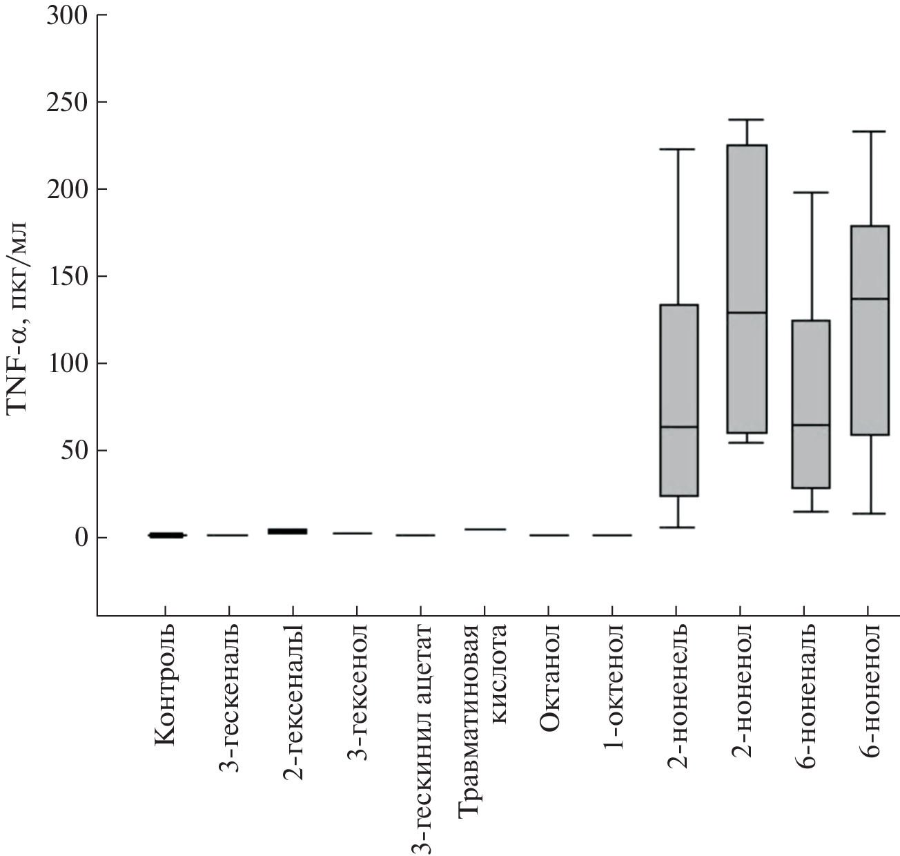 Short-chain and medium-chain aldehydes and their derivatives, yielded by the enzymes hydroperoxide lyases from fatty acids, are present in many products of plant origin. They are often used as supplements to food to postpone its expiration date and to add a flavor of freshness. Since these compounds can be absorbed by the intestine cells and pass into systemic circulation, it is important to be aware of their influence on human health. In the present study, the potential biological activity of aldehydes and alcohols with chains containing six to nine carbon atoms were assessed. Their proinflammatory activities were tested in the experimental system based on donors’ whole blood. It was found that nine-carbon oxylipins stimulated the synthesis of the proinflammatory TNF-α cytokine (tumor necrosis factor alpha), and the stimulation by the aldehydes was weaker than that caused by the alcohols. The oxylipins containing six or eight carbons did not manifest proinflammatory activity. The obtained data may be of help to work out nutritional recommendations for patients suffering from inflammatory diseases.