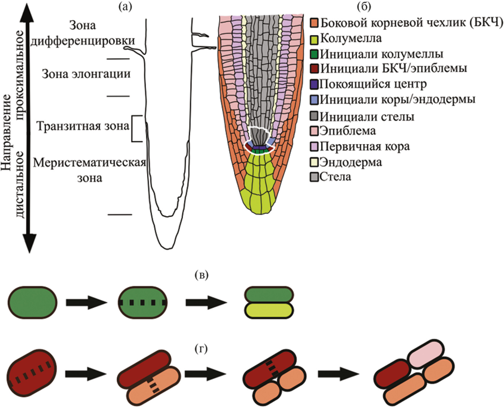 Рис. 1. Зоны корня и клеточная структура корневого чехлика: а – схематическое изображение строения корня Arabidopsis thaliana с указанием зон; б – клеточная организация кончика корня A. thaliana; белым цветом выделена ниша стволовых клеток, куда входит покоящийся центр и стволовые клетки (инициали); в – продукция клеток колумеллы путем асимметричных периклинальных делений инициалей колумеллы; г – продукция клеток бокового корневого чехлика (БКЧ) и эпиблемы в результате последовательных периклинального и антиклинального делений инициалей эпиблемы и БКЧ соответственно. Пунктирной линией на панелях (в) и (г) отмечена плоскость деления. Цветовая кодировка на этих панелях соответствует панели (б).