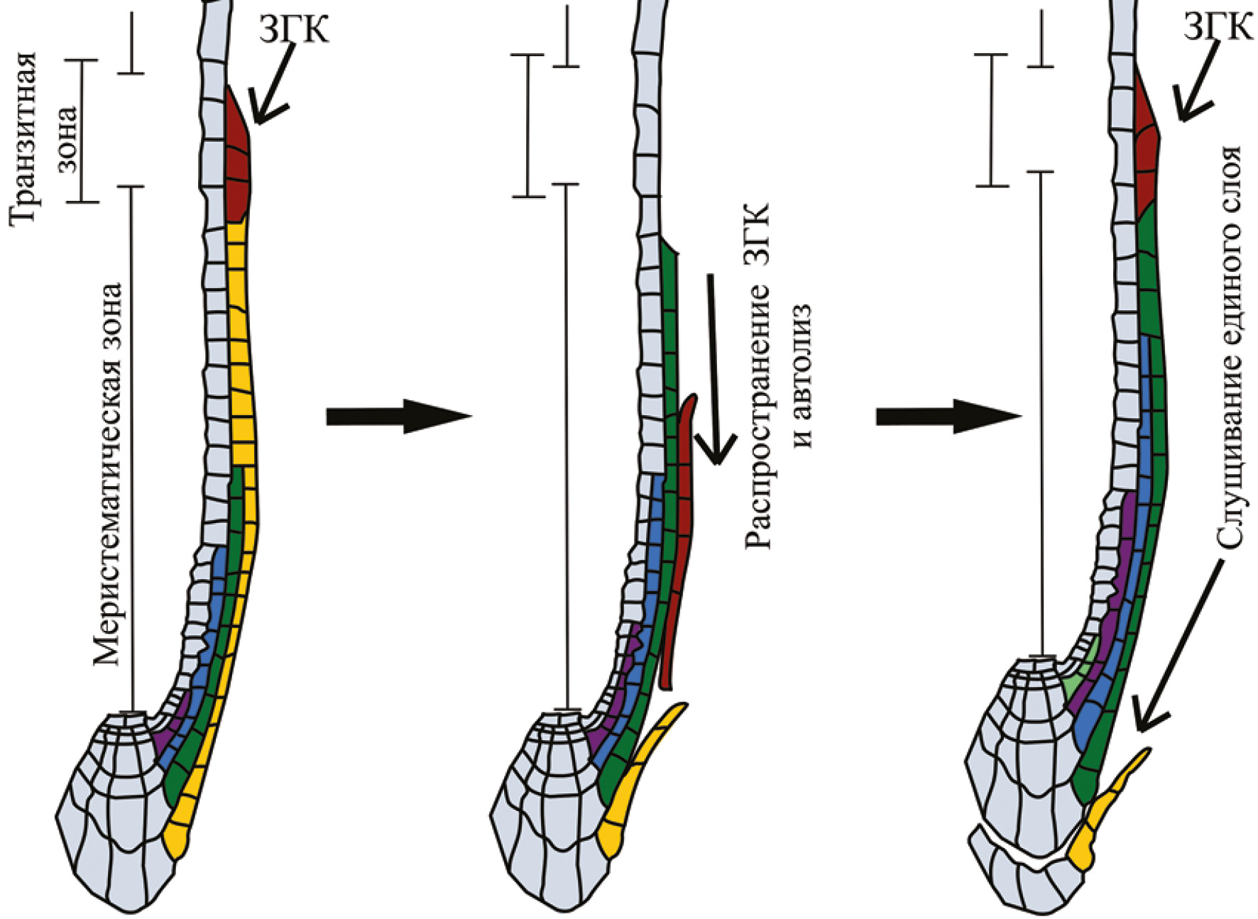 Рис. 2. Процесс удаления старых клеток корневого чехлика. Цветовая кодировка (желтый, светло- и темно-зеленый, синий, фиолетовый) указывает на отдельные слои бокового корневого чехлика. Красным цветом отмечена запрограммированная гибель клеток (ЗГК) во внешнем слое бокового корневого чехлика. Ключевые события удаления внешнего слоя клеток корневого чехлика указаны тонкими стрелками. К ним относятся запрограммированная гибель клеток бокового корневого чехлика, автолиз погибших клеток, а также слущивание единого слоя живых клеток колумеллы.