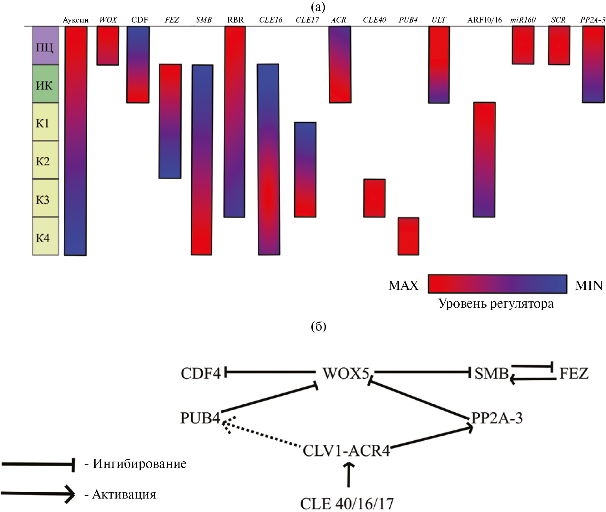 Рис. 3. Регуляция деления и дифференцировки клеток колумеллы: а – распределение регуляторов в корневом чехлике. Красный цвет шкалы соответствует максимальному уровню (MAX), синий – минимальному детектируемому уровню (MIN). Белый цвет отражает отсутствие регулятора в клетках. Каждый регулятор имеет свой максимальный и минимальный уровень. Белки указаны полужирным прямым текстом, транскрипты – курсивом. ПЦ – покоящийся центр, ИК – инициали колумеллы, К1–К4 – дифференцированные клетки колумеллы; б – генетическое взаимодействие регуляторов делений и дифференцировки клеток. Пунктиром указано гипотетическое взаимодействие (требует дальнейшего изучения).