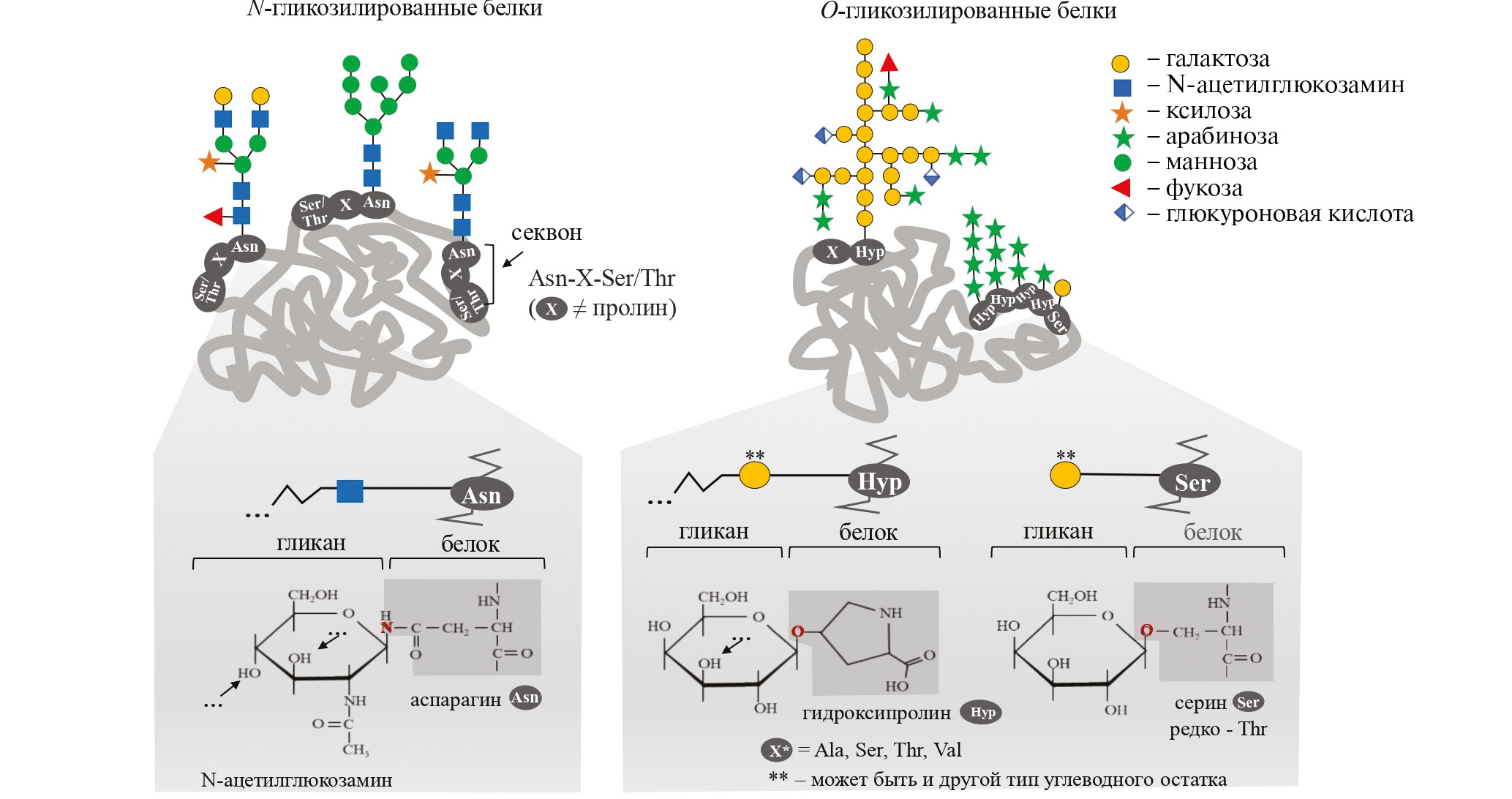 Функциональные особенности белков в значительной степени определяются ко-/посттрансляционными модификациями, влияющими на их активность, транспорт, локализацию, взаимодействие с другими белками, что в свою очередь, находит отражение в изменении фенотипа организмов и в их способности адаптироваться к условиям окружающей среды [1, 2]. Регулярно пополняемый список включает более двухсот различных посттрансляционных модификаций белков растений, которые могут быть как широко распространенными, так и редкими, вплоть до уникальных [3]. Считается, что ферментативное гликозилирование (присоединение углеводных фрагментов к молекуле белка) является одной из самых распространенных и при этом наиболее сложной из всех посттрансляционных модификаций. Связанные с белками гликаны представляют собой разнообразные олигосахаридные структуры, синтез которых обеспечивается сложным ферментативным механизмом, опосредуемым, по меньшей мере, более чем 250 генами, охарактеризованными на сегодняшний день [4, 5]. Эта модификация включает О-гликозилирование и N-гликозилирование, в зависимости от типа связи и места присоединения гликана [3]. N-гликаны связываются с цепью белка через амидную связь с остатком аспарагина в мотиве Asn-X-Ser/Thr, где X может быть любой аминокислотой, кроме пролина. Эта аминокислотная последовательность в молекуле белка, по которой происходит присоединение гликанов при N-гликозилировании, получила название секвона. Было показано, что аминокислота в положении X, а также аминокислота, следующая за мотивом Asn-X-Ser/Thr, важна для эффективного N–гликозилирования [6, 7]. О-гликаны в растениях связываются с белками преимущественно через гидроксильную группу гидроксипролина, серина и реже – треонина (рис. 1).