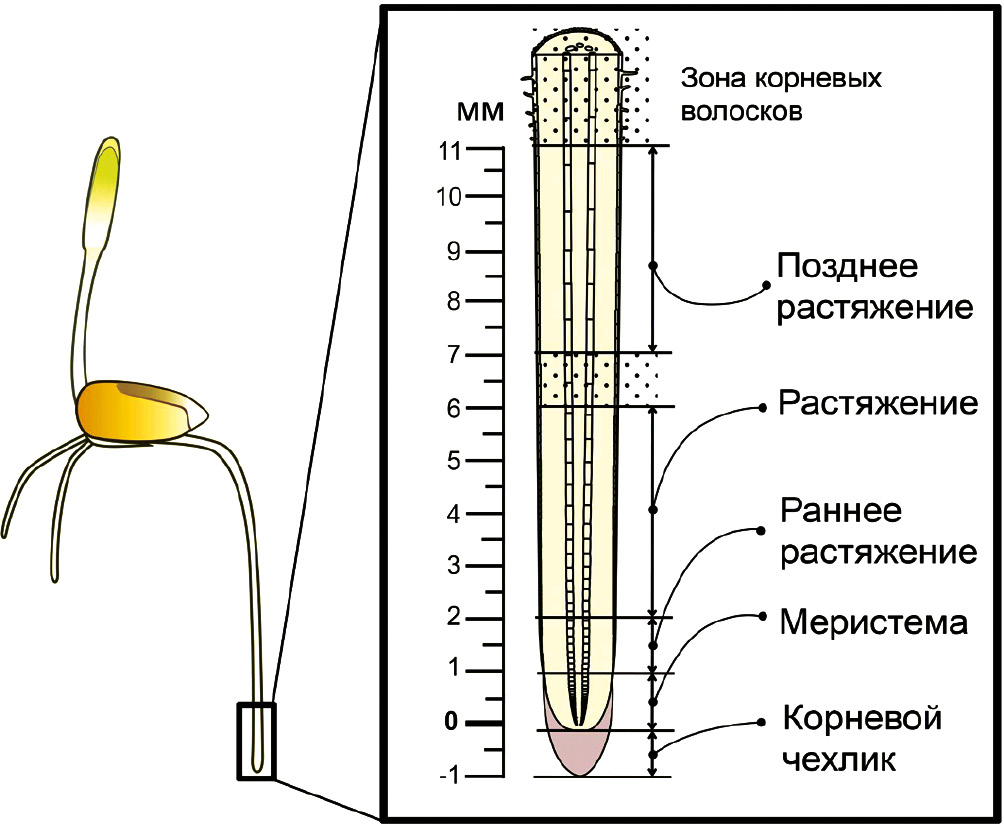 Растительный материал. Исследования проводили на корнях 5-дневных проростков кукурузы (Zea mays L.), сорт Машук (Нива Татарстана, Казань, Россия), выращенных в темноте при 27°С. Первичный корень проростка был разделен лезвием на зоны по следующей схеме: корневой чехлик, меристема (0–1 мм, считая от соединения корня с чехликом), зона раннего растяжения (1–2 мм), активного растяжения (2–6 мм) и позднего растяжения (7–10 мм) (рис. 1). Распределение зон соответствует опубликованным ранее работам Kozlova с соавт. [15, 19] и дополнительно верифицировано путем измерения длин клеток коры и ризодермы.