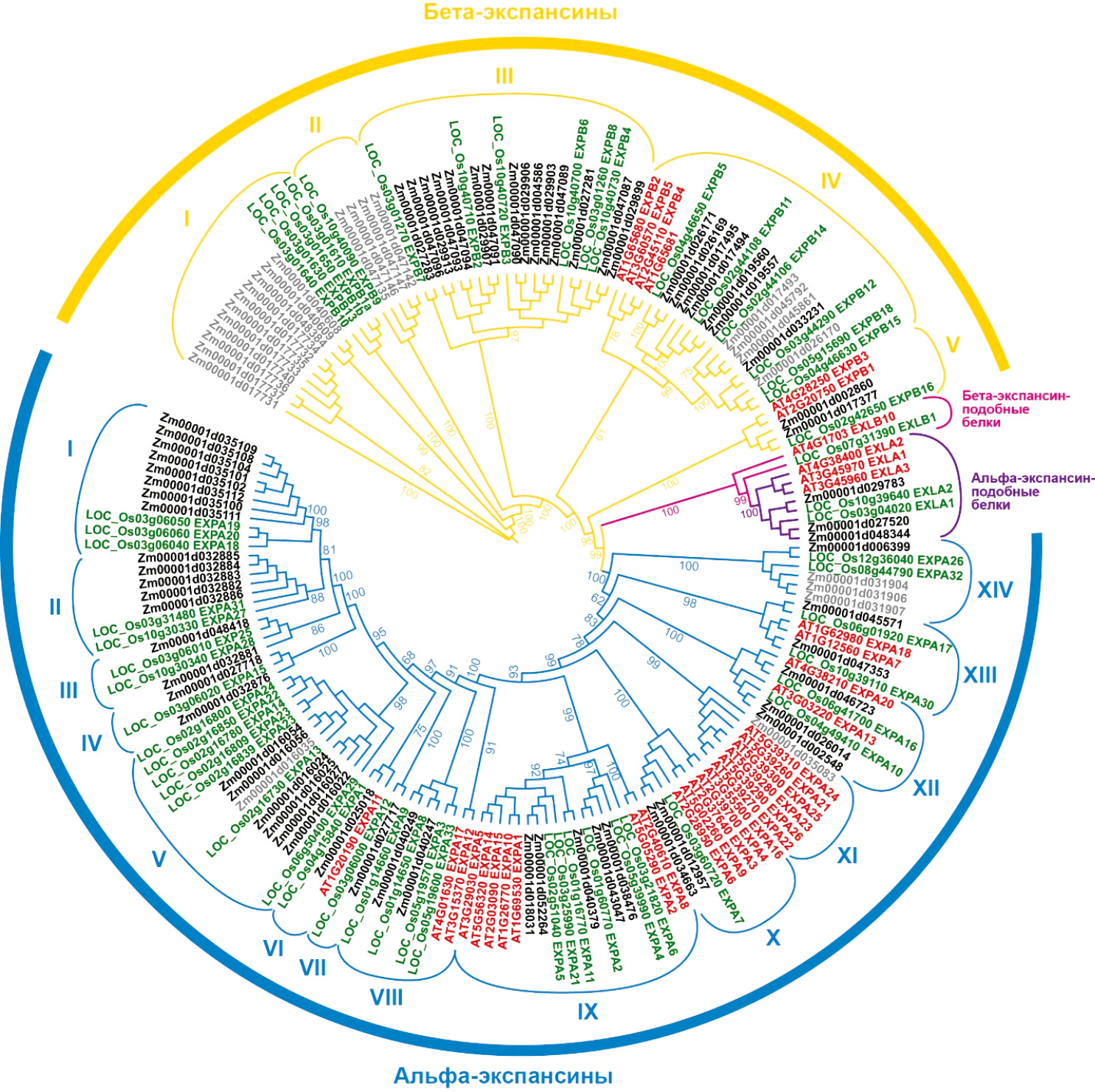 На филогенетическом древе экспансинов четко выделялись различные клады, которые обозначены римскими цифрами (рис. 2): альфа-экспансины кукурузы подразделены нами на 14 основных клад, а бета-экспансины – на 5. В каждой кладе альфа-экспансинов кукурузы присутствовали также альфа-экспансины риса, а подобные белки A. thaliana отсутствовали почти в половине клад (I–V, XIV). Для бета-экспансинов кукурузы характерна большая специфичность: в I–III кладах отсутствовали гомологи из A. thaliana, а I и II клады бета-экспансинов кукурузы хорошо отделялись и от генов риса (рис. 2).