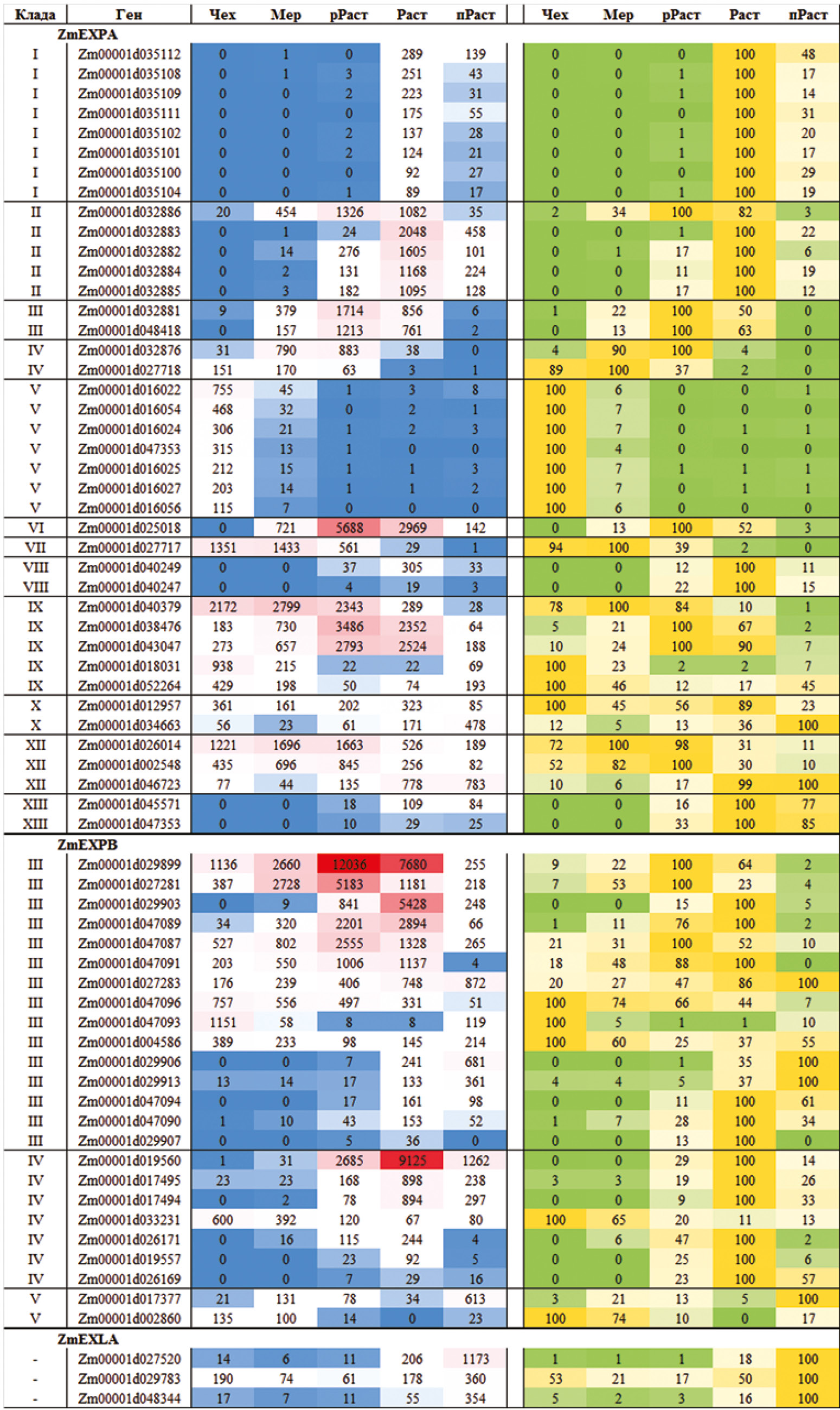Рис. 3. Уровень транскриптов генов экспансинов, экспрессирующихся (TGR ≥ 16 хотя бы в одной зоне) в различных зонах корня проростка кукурузы. Гены отсортированы по подсемействам (EXPA – альфа-экспансины, EXPB – бета-экспансины, EXLA – альфа-экспансин-подобные белки), внутри подсемейств – по кладам (обозначены римскими цифрами и соответствуют филогенетическому древу на рис. 2), а внутри клад – по убыванию суммарных значений TGR во всех образцах. Тепловая карта экспрессии: левая панель – значения TGR; правая панель – относительный уровень экспрессии генов в процентах, где за 100% принято максимальное для каждого гена значение TGR. Чех – чехлик, Мер – меристема, рРаст – ранее растяжение, Раст – активное растяжение, пРаст – позднее растяжение.