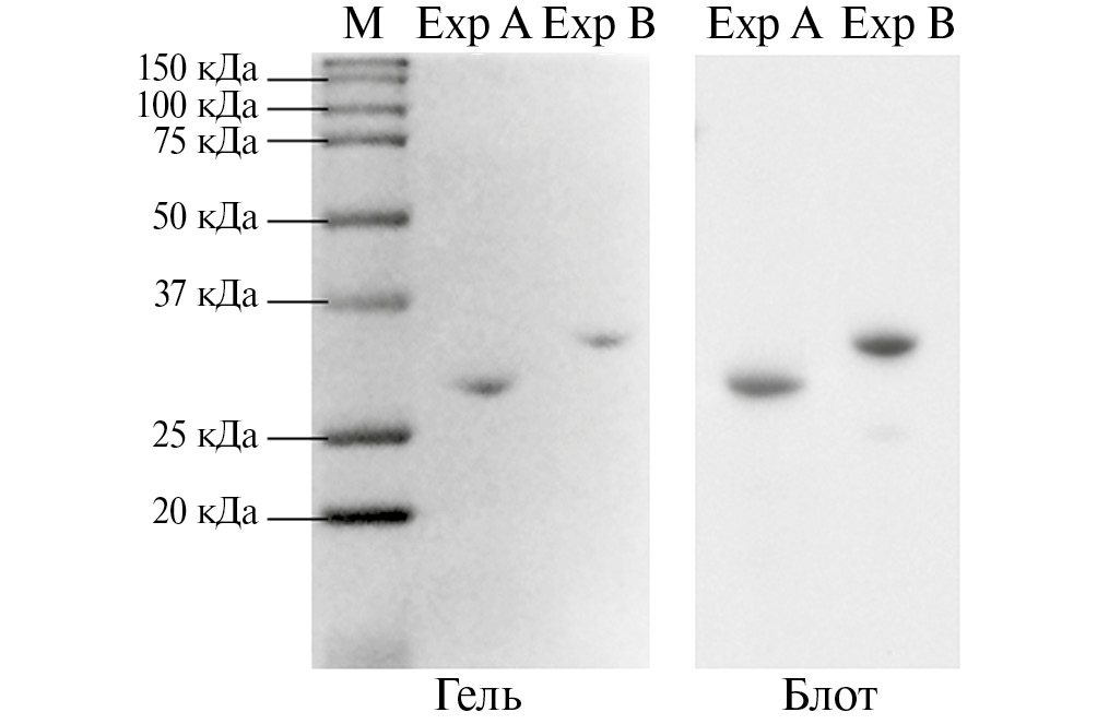 Для проверки чистоты препаратов проводили электрофорез на 12% полиакриламидном геле с последующим иммуноблоттингом с антителами мыши, узнающими гистидиновую метку (“Bio Rad”, США) (разведение 1 : 5000), и антителами козы, конъюгированными с пероксидазой хрена и узнающими иммуноглобулины мыши (“Аbcam”, Великобритания) (разведение 1 : 10000). Визуализация полос осуществлялась за счет окисления пероксидазой хемилюминесцентного субстрата люминола в присутствии перекиси и кумаровой кислоты. Результирующая хемилюминесценция детектировалась в системе визуализации ChemiDoc (“Bio Rad”, США).