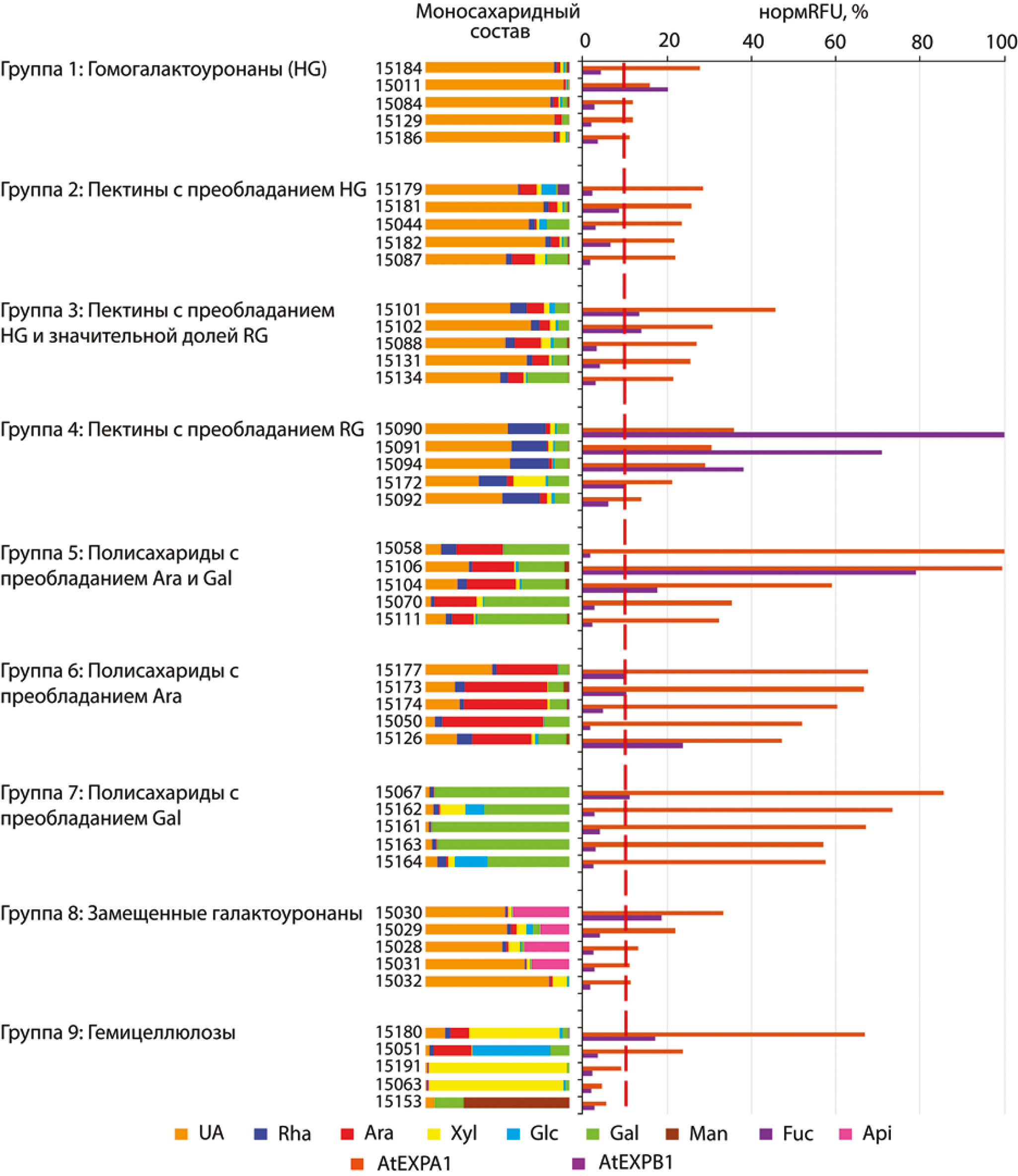Рис. 5. Взаимодействия рекомбинантных альфа- и бета-экспансинов (AtEXPA1 и AtEXPB1) с полисахаридами растительной клеточной стенки, входящими в состав гликоэррея. Представлено по пять полисахаридов с максимальным уровнем взаимодействия для каждой из 9 групп полисахаридов, существенно различающихся по моносахаридному составу. Для сопоставления результатов отдельных экспериментов с AtEXPA1 и AtEXPB1 данные представлены в % от максимального значения RFU в каждом эксперименте (% норм RFU). Пороговой величиной для отсечки полисахаридов, не продемонстрировавших взаимодействия, считали 10% от максимально значения RFU (указано вертикальной пунктирной линией).
