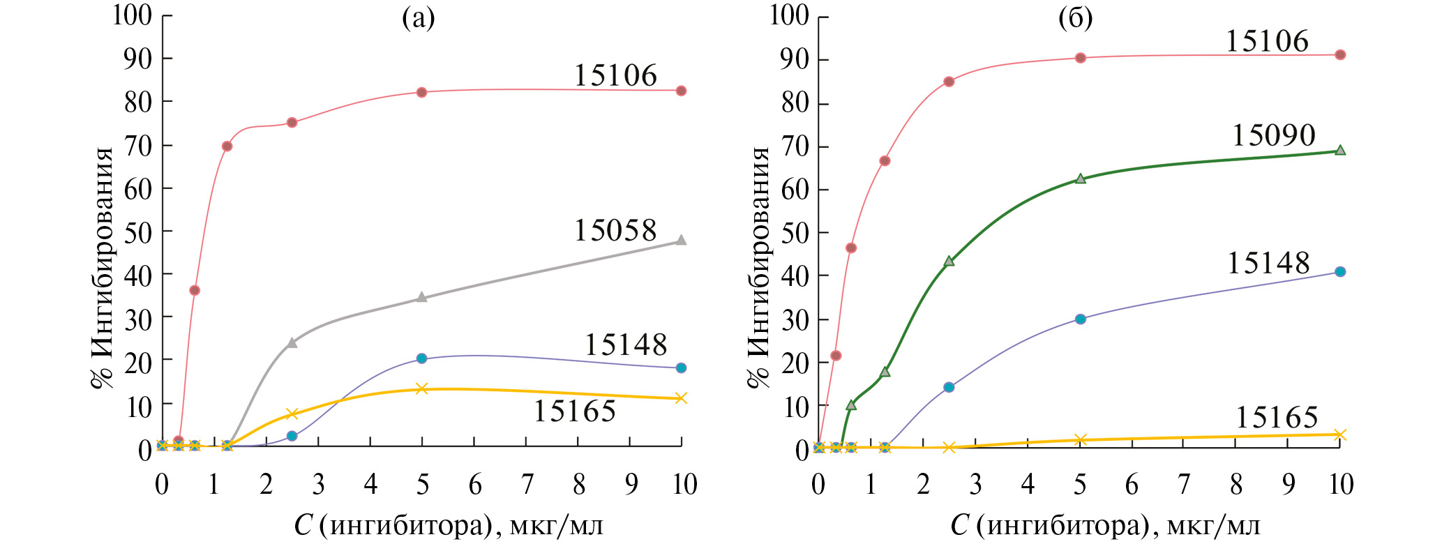 По результатам ингибиторного анализа взаимодействие альфа- и бета-экспансинов с полисахаридом 15106 было подтверждено – концентрация 50% ингибирования (IC50) составила 0.80 и 0.65 мкг/мл соответственно (рис. 6). В качестве ингибиторов, помимо самого образца 15106, были выбраны охарактеризованные выше полисахариды 15058 (арабиногалактан акации) и 15090 (пектин березы пушистой), принадлежащие к разным группам и продемонстрировавшие разную интенсивность взаимодействия с экспансинами на чипе. Также был взят ксилоглюкан из тамаринда (образец 15148, группа 9), т.к. считается, что основными мишенями альфа-экспансинов могут быть участки тесного взаимодействия ксилоглюкана и микрофибрилл целлюлозы [1]. По результатам гликоэррея этот полисахарид значимого связывания не продемонстрировал и не вошел в топ-5 своей группы (рис. 5). В качестве отрицательного контроля был взят фруктан из цикория (15165) – растительный полисахарид, не локализующийся в клеточной стенке.