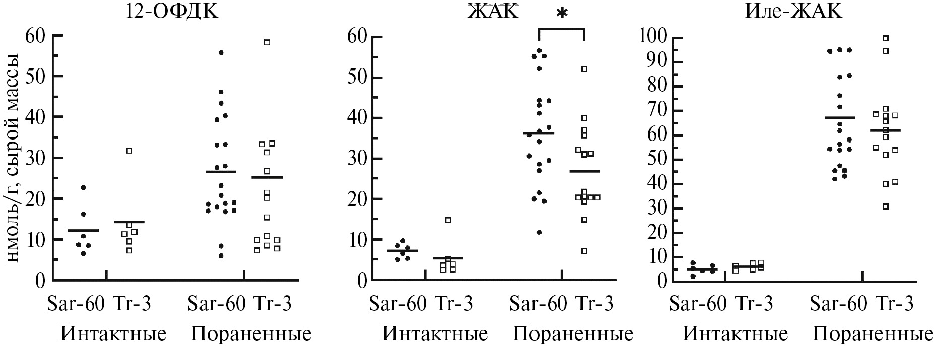 Рис. 2. Содержание индивидуальных жасмонатов (12-ОФДК; ЖАК; Иле-ЖАК) в интактных и пораненных листьях гексаплоидной пшеницы Саратовская-60 (Sar-60) (закрашенные круги) и трансгенного растения, сверхэкспрессирующего AtOPR3 (Tr-3) (незакрашенные квадраты). Каждый круг и квадрат представляют индивидуальное растение; горизонтальные линии – среднее значение. Звездочка обозначает статистически значимое различие между двумя генотипами при P < 0.05.