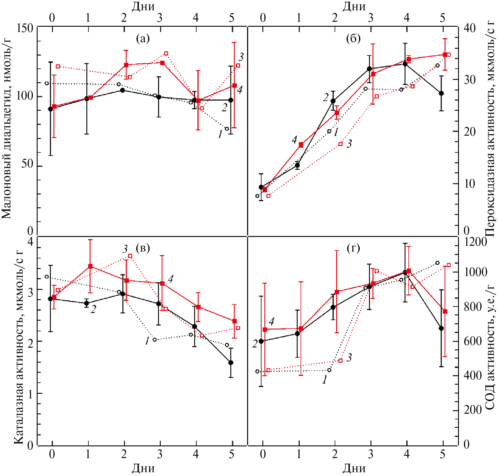 Рис. 4. Зависимость содержания МДА и активности антиоксидантных ферментов в листовой ткани Sar-60 (1, 2) и Tr-3 (3, 4), не зараженной (1, 3) и зараженной B. cinerea (2, 4), от времени, прошедшего с начала инокуляции B. cinerea: (а) содержание МДА; (б) активность пероксидазы; (в) активность каталазы; (г) активность СОД. Для зараженных листьев представлены средние значения и стандартные отклонения по 2–3 биологическим повторностям.
