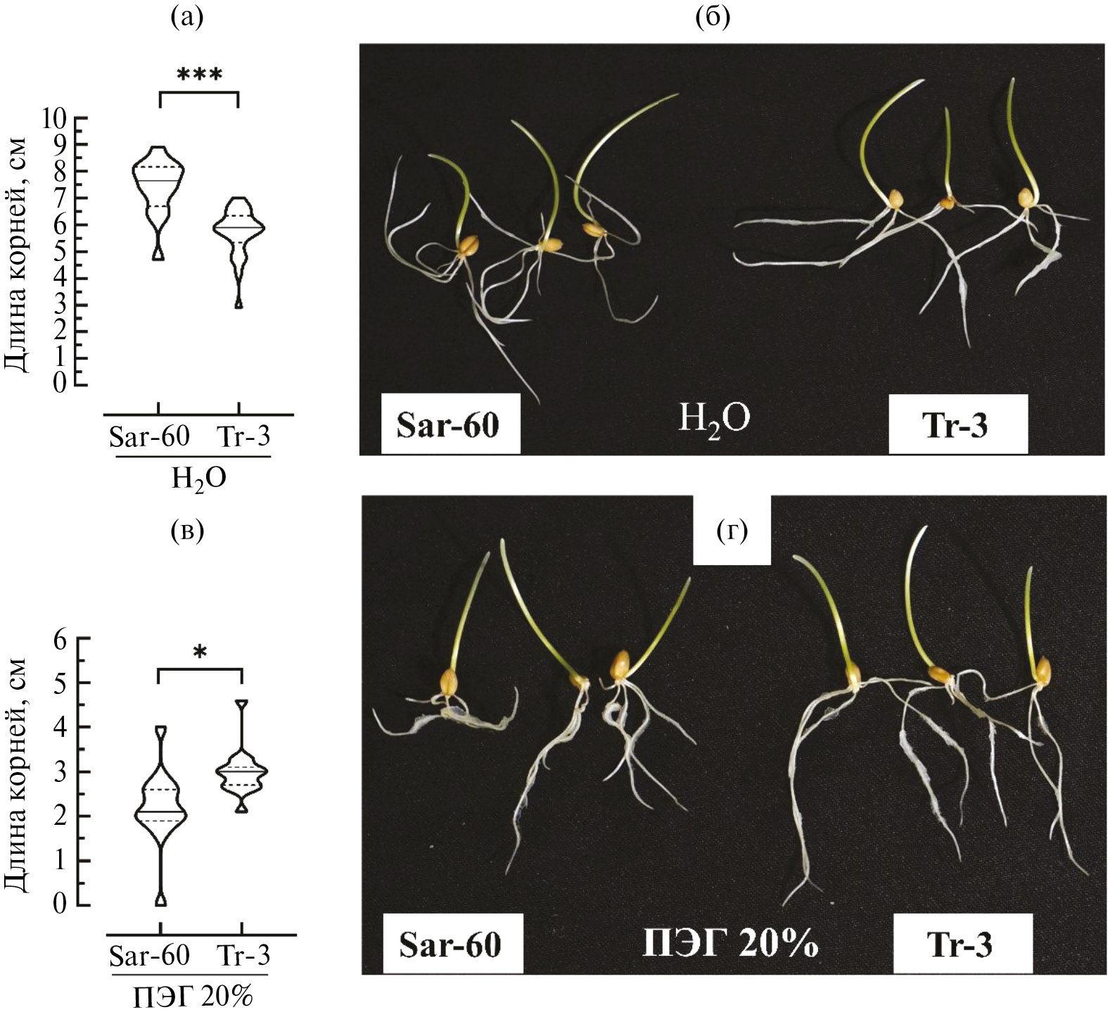 Рис. 5. Рост корней проростков нетрансгенных (Sar-60) и трансгенных растений (Tr-3) на воде (а, б) и 20% растворе ПЭГ 6000 (в, г). (а, в) – репрезентативные изображения проростков на воде (а) и на ПЭГ (в). Графики отображают длину самых развитых корней проростков (n = 15–25); сплошные горизонтальные линии показывают медиану, пунктирные линии – 75 и 25 процентили распределения. Звездочками отмечены статистически значимые различия между генотипами, согласно оценке по t-тесту Стьюдента (* – P ≤ 0.05), (*** – P ≤ 0.001).