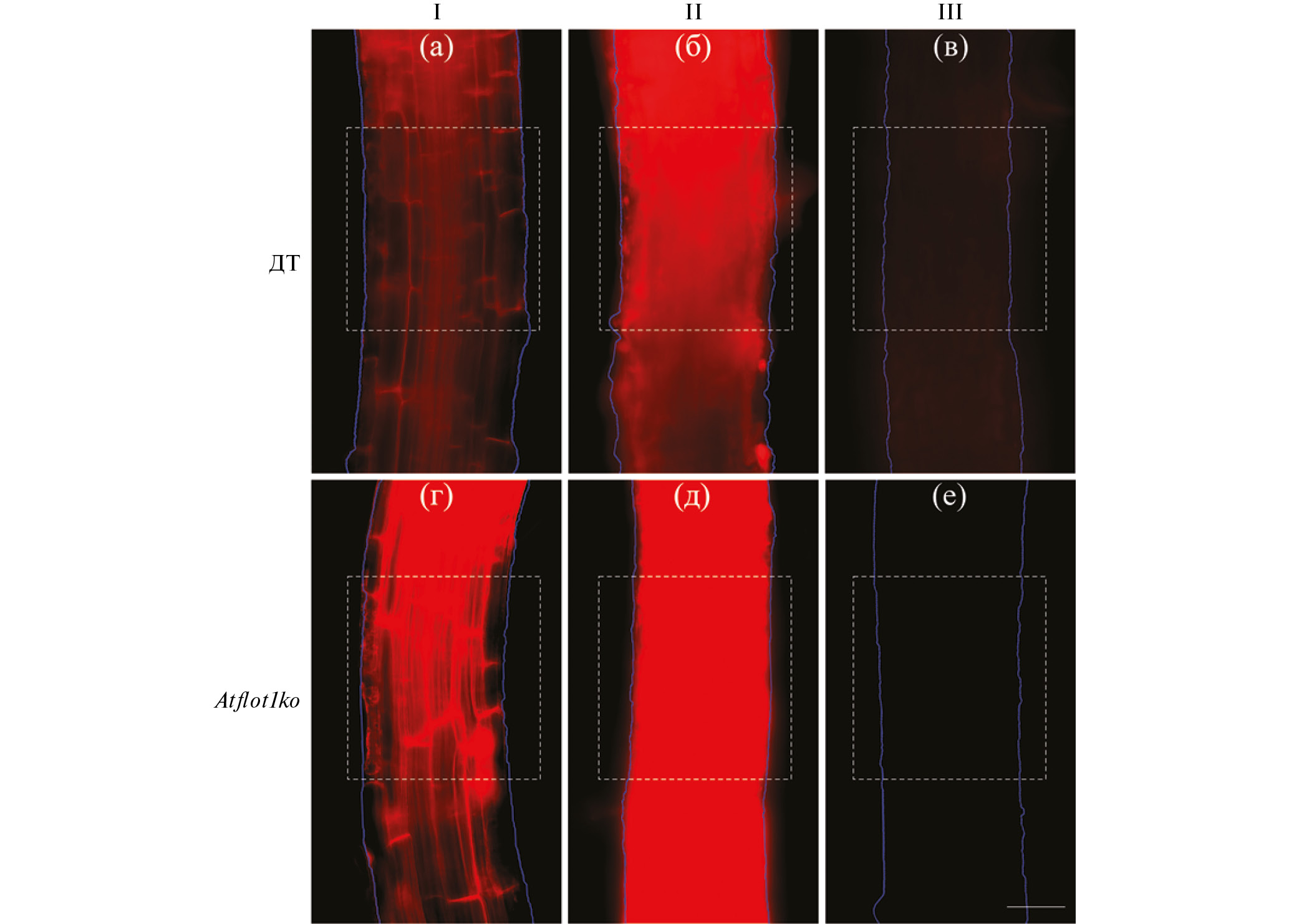 Рис. 2. Интенсивность флуоресценции FM4-64 в клетках корней 5-дневных проростков растений A. thaliana дикого типа (ДТ) (а, б, в) и нокаут-мутанта (AtFlot1ko) (г, д, е). I – контроль (а, г), II – 10 мкМ flg22 (б, д), III – 10 мкМ flg22 + + 100 мкМ НУК + 10 мМ MßЦД (в, е). Пунктирной рамкой отмечена область корня, используемая для морфометрического расчета интенсивности сигнала FM. Масштаб – 40 мкм.