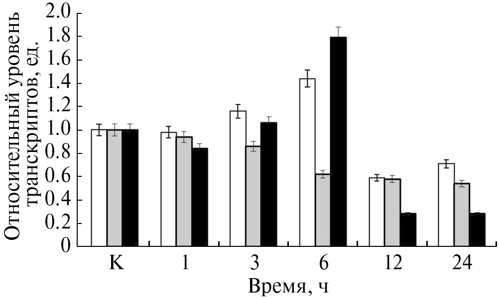 Рис. 3. Относительный уровень транскриптов генов SSADHA (белые столбцы), SSADHB (серые столбцы) и SSADHD (черные столбцы) в листьях пшеницы в стрессовых условиях. Ось абсцисс – время инкубации в 150 мМ растворе NaCl; К – контрольный образец.
