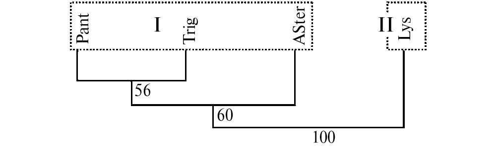 Рис. 1. Дендрограмма сходства видов по составу жирных кислот суммарных липидов у галофитов (подорожник – Pant., триостенник – Trig., астра – Aster, млечник – Lys.), полученная методом ближайшего соседа по матрице нормированных евклидовых дистанций с нанесенными оценками бутстреп-вероятностей ветвей; пунктиром разделены кластеры растений с доверительной вероятностью > 95%.