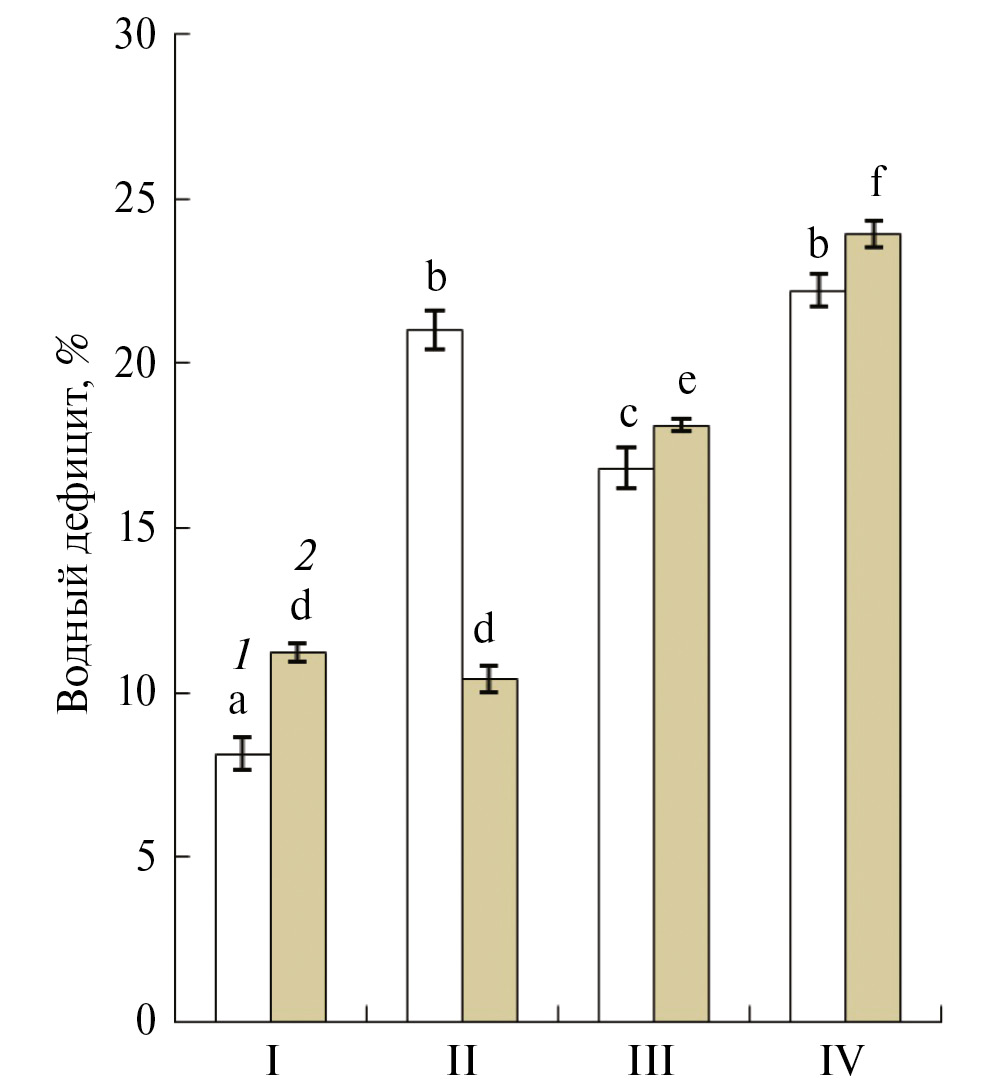 Рис. 1. Влияние обезвоживания и обработки мелатонином на водный дефицит тканей зародышей группы 1 (1) и группы 2 (2) 18-часовых семян гороха. Варианты опытов: I – контрольные семена, II – семена после обработки мелатонином, III – семена после обезвоживания, IV – семена после обезвоживания и обработки мелатонином. На рисунках представлены средние арифметические значения и их стандартные ошибки. Статистически значимые различия между средними значениями определяли с помощью Tukey тестa в программе ANOVA, результаты, отмеченные разными буквами, статистически значимы при Р ≤ 0.05.