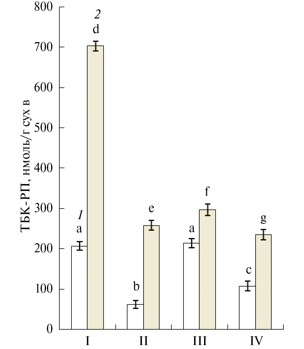 Рис. 2. Влияние обезвоживания и обработки мелатонином на содержание ТБК-РП в тканях зародышей группы 1 (1) и группы 2 (2) 18-часовых семян гороха. Варианты опытов: I – контрольные семена, II – семена после обработки мелатонином, III – семена после обезвоживания, IV – семена после обезвоживания и обработки мелатонином. На рисунках представлены средние арифметические значения и их стандартные ошибки. Статистически значимые различия между средними значениями определяли с помощью Tukey тестa в программе ANOVA, результаты, отмеченные разными буквами, статистически значимы при Р ≤ 0.05.
