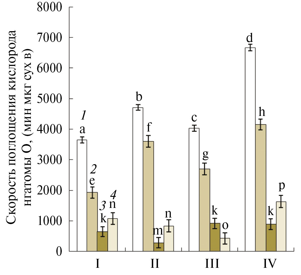 Рис. 4. Влияние обезвоживания и обработки мелатонином на скорость поглощения кислорода зародышами группы 2 18-часовых семян: (1) – скорость поглощения кислорода зародышами (Vобщ); (2) – активность цитохромного пути дыхания; (3) – максимальная активность альтернативного пути дыхания; (4) – остаточное дыхание. Варианты опытов: I – контрольные семена, II–семена после обработки мелатонином, III – семена после обезвоживания, IV – семена после обезвоживания и обработки мелатонином. На рисунках представлены средние арифметические значения и их стандартные ошибки. Статистически значимые различия между средними значениями опытных и контрольных образцов определяли с помощью Tukey тестa в программе ANOVA, результаты, относящиеся к соответствующему субстрату (1 или 2), отмеченные разными буквами, статистически значимы при Р ≤ 0.05.