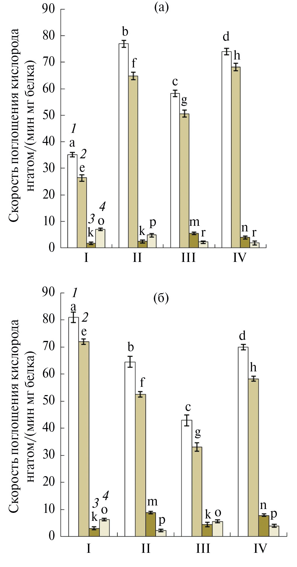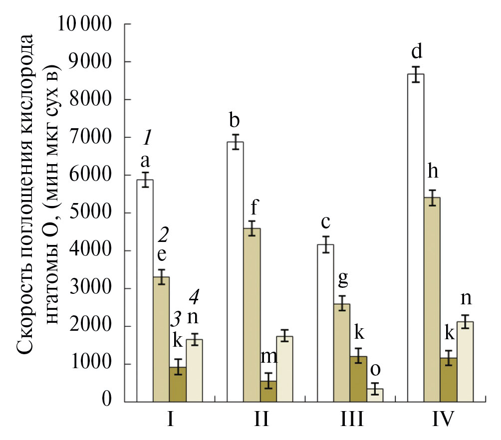 Рис. 6. Влияние обезвоживания и обработки мелатонином на дыхание и активность различных путей окисления малата (а) и сукцината (б) митохондриями эпикотилей 5-дневных проростков гороха: (1) – скорость окисления субстратов в состоянии 3 (V3); (2) – скорость окисления субстратов по цитохромному пути (Vцит); (3) – скорость окисления субстратов по альтернативному пути (Vальт); (4) – скорость остаточного дыхания (Vост). Варианты опытов: I – контрольные семена, II–семена после обработки мелатонином, III – семена после обезвоживания, IV – семена после обезвоживания и обработки мелатонином. На рисунках представлены средние арифметические значения и их стандартные ошибки. Статистически значимые различия между средними значениями опытных и контрольных образцов определяли с помощью Tukey тестa в программе ANOVA, результаты, относящиеся к соответствующему субстрату (1 или 2), отмеченные разными буквами, статистически значимы при Р ≤ 0.05.