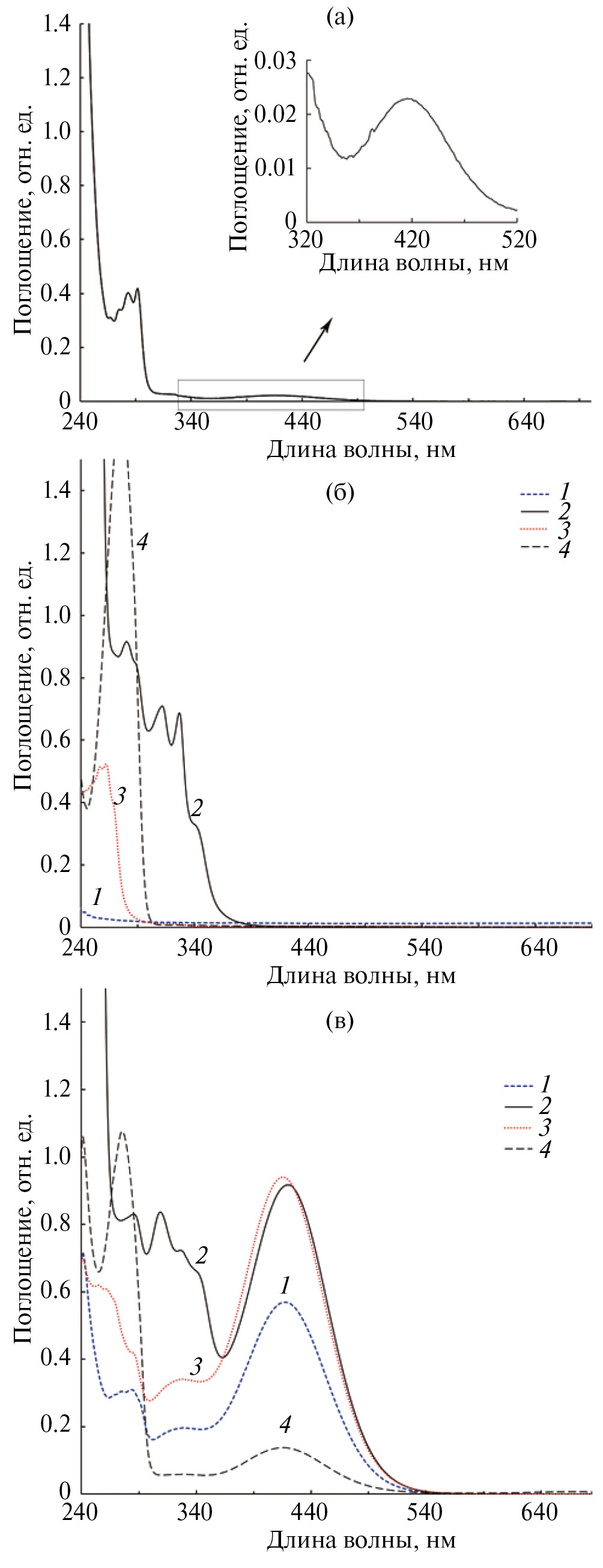 Для получения спектров поглощения чистых веществ в диапазоне 200–700 нм алкалоиды и БКЗ были растворены в хлороформе в конечной концентрации 10–4 М как описано в разделе “Материалы и Методы”; в качестве холостого раствора был использован хлороформ. Было выявлено, что БКЗ (рис. 1а) и алкалоиды (рис. 1б) поглощают свет в УФ области. Пики поглощения в области 200–380 нм были: для БКЗ – 244, 284, 294 нм, для атропина – 209 нм, для папаверина гидрохлорида – 254 нм, для никотина – 264 нм, для кофеина – 260 нм. В видимой области в спектре БКЗ обнаружено слабое поглощение в области 420 нм с оптической плотностью менее 0.02 ед. (рис. 1а, верхняя вставка), в спектре алкалоидов в этой области – плато (рис. 1б). Однако при смешивании БКЗ с образцами алкалоидов в соотношении 1 : 1 появлялся пик с широким плато в области 410–420 нм, что свидетельствует о формировании связи между БКЗ и алкалоидом (рис. 1в).