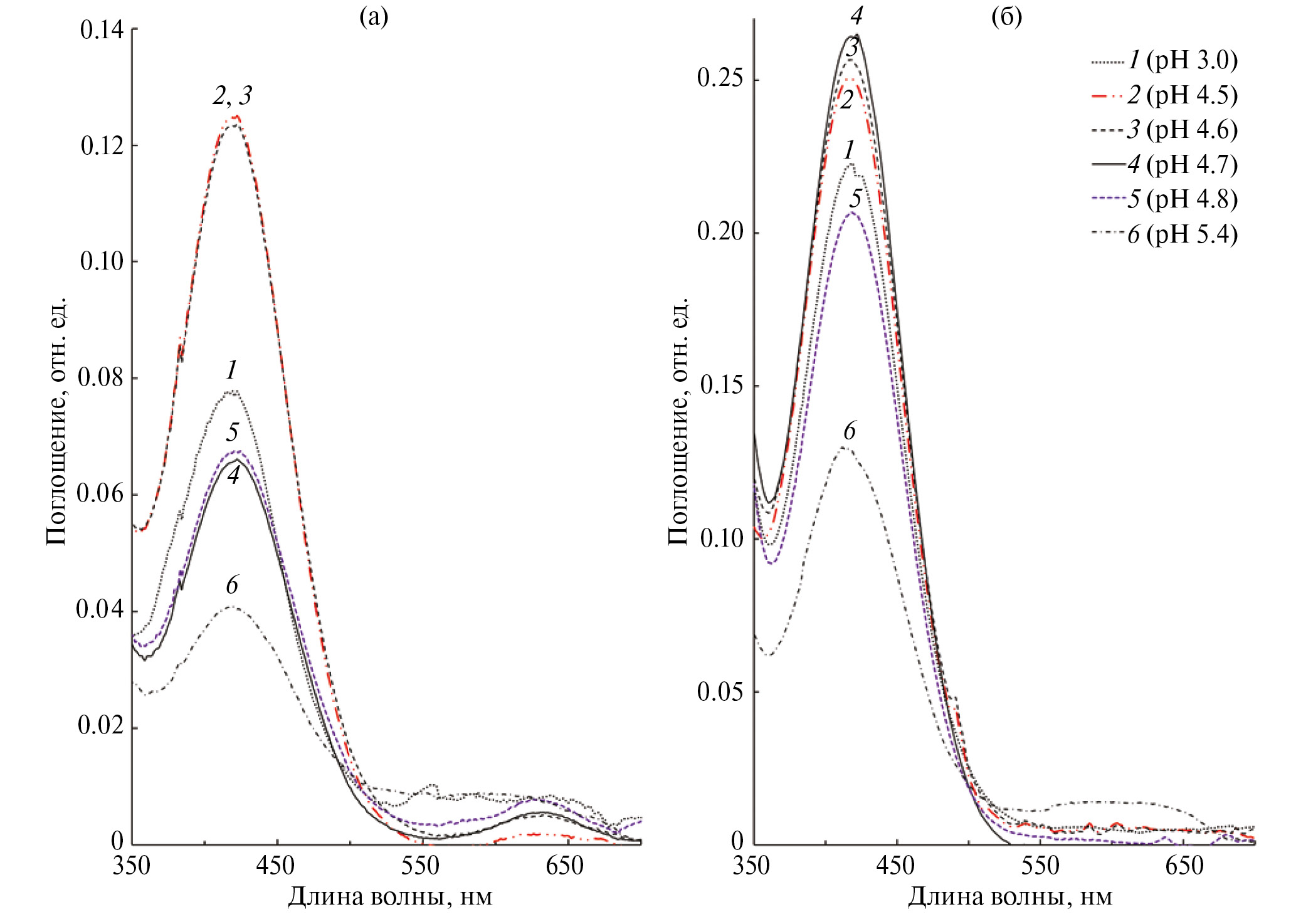 Для того чтобы подобрать оптимальное значение рН для формирования ионной пары, были протестированы фосфатно-цитратные буферные растворы с рН 3.0, 4.5, 4.6, 4.7, 4.8 и 5.4. В первую очередь были сняты спектры поглощения холостых растворов, в качестве зануляющего раствора был использован хлороформ (рис. 2а). Было выявлено, что при использовании буфера с рН 4.5 и рН 4.6 оптическая плотность при 417 нм была наивысшей и составляла 0.12 опт. ед. Можно предположить, что при рН 4.5, 4.6 в хлороформ переходит наибольшее количество анионной формы БКЗ, чем при рН 3.0, 4.7, 4.8, 5.4. Далее были сняты спектры поглощения ионных пар БКЗ–папаверин, сформированных при разных рН, каждый с использованием своего холостого раствора. Как следует из рис. 2б, рН буфера влияло на оптическую плотность раствора с ионной парой. Следует отметить, что при использовании буферов с рН 4.5, 4.6 и 4.7 и значения оптической плотности при 417 нм были самыми высокими среди всех снятых спектров и составляли 0.25, 0.255, 0.264 опт. ед., соответственно (рис. 2б). При рН 5.4 оптическая плотность при 417 нм была наименьшей и составляла 0.13 опт. ед. В дальнейших исследованиях для приготовления реакционной смеси был выбран буфер с рН 4.7, поскольку при его использовании поглощение ионной пары было максимальным (0.26 опт. ед.), а поглощение холостого раствора приемлемо невысоким (0.06 опт. ед.).