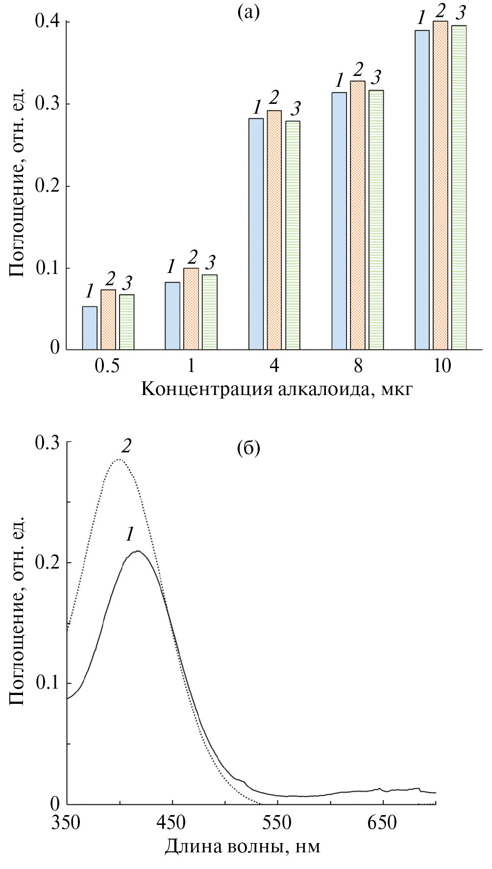 Для построения калибровочных кривых использовали 0.1% раствор атропина сульфата, папаверина гидрохлорида, никотина. К 0.5 мл фосфатно-цитратного буфера, рН 4.7 добавляли необходимый объем алкалоида (0.5, 1, 2, 4, 5, 6, 8, 10, 20 мкл) и 0.5 мл 0.1 мМ водного раствора БКЗ. Для формирования ионной пары БКЗ–алкалоид реакционную смесь (буфер, алкалоид, БКЗ) выдерживали 3–5 мин при комнатной температуре и затем экстрагировали дважды хлороформом. Для этого реакционную смесь интенсивно перемешивали на вортексе (“Elmi”, Латвия) с 0.5 мл хлороформа, затем дожидались расслоения фаз, пипеткой отбирали нижнюю фазу, а к водной фазе добавляли 0.5 мл хлороформа и повторяли процедуру. Конечный объем хлороформного образца доводили чистым хлороформом до 1 мл. Для получения холостого раствора к буферу добавляли БКЗ и проводили экстракцию хлороформом как описано выше. Образцы сканировали на спектрофотометре LAMBDA 25 (“PerkinElmer”, США) в диапазоне от 350 до 700 нм. По значениям оптической плотности при максимуме поглощения ионной пары (417 нм – для атропина, 418 нм – для папаверина, 414 нм – для никотина) были построены калибровочные кривые.