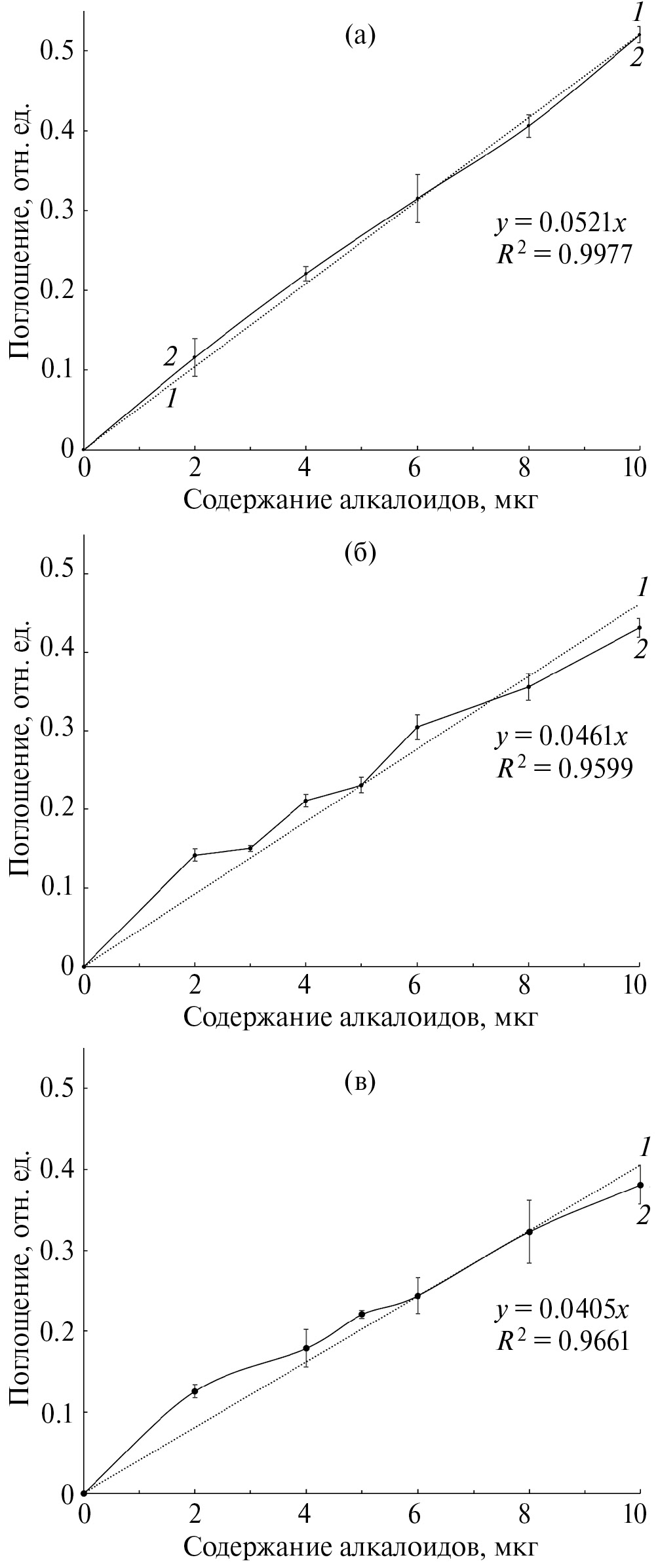 Рис. 4. Калибровочные кривые для определения содержания алкалоидов в растительных образцах: по атропину (а), папаверину (б), никотину (в). Пунктирными линиями отмечены линии тренда (1) для каждой калибровочной кривой (2).