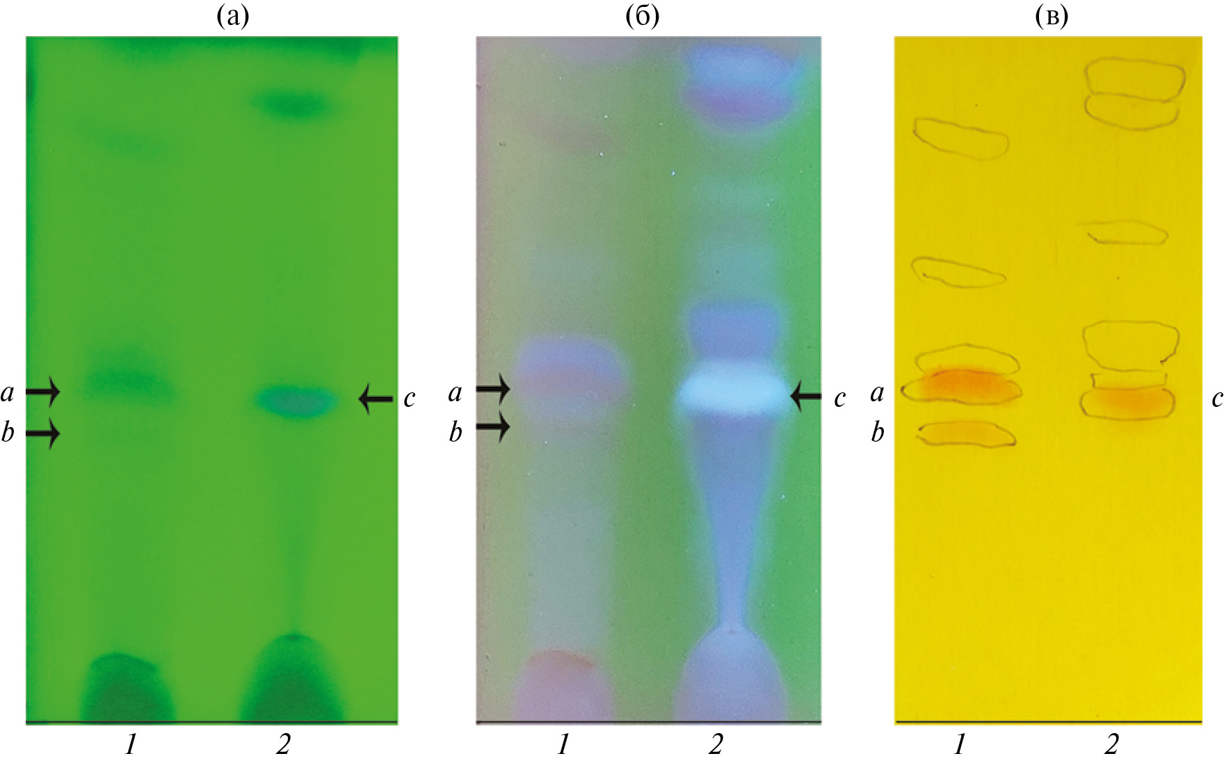 Рис. 5. ТСХ экстрактов аптечного препарата “Руты душистой трава” (1) и растений-регенерантов Руты душистой (2): а – флуоресценция при 254 нм, б – флуоресценция при 312 нм, в – окрашивание реактивом Драгендорфа. Стрелками и разными буквами латинского алфавита отмечены алкалоиды, прореагировавшие с реактивом Драгендорфа.
