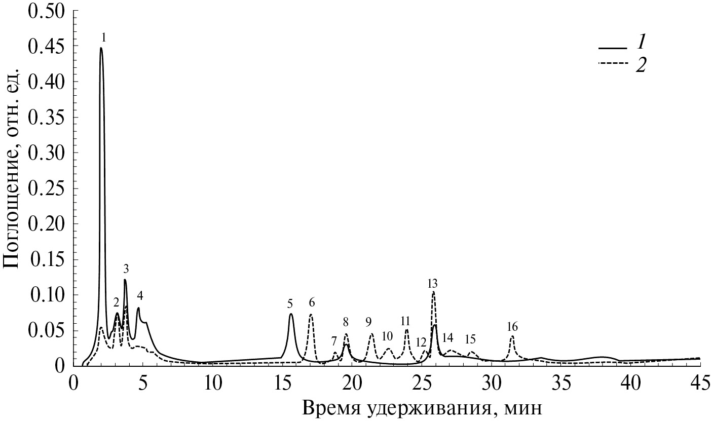 ВЭЖХ анализ очищенной фракции алкалоидов аптечного препарата и растений-регенерантов выявил наличие 16 пиков, из которых 6 пиков присутствовали в спектрах обоих образцов, но имели разную интенсивность (рис. 6). Пик 5 был специфичен для образца аптечного препарата, а пики 6, 7, 9, 10, 12, 14, 15 и 16 присутствовали только в образце растений-регенерантов. В ВЭЖХ-спектре образца аптечного препарата наибольшую интенсивность имел пик 1, в спектре растений-регенерантов по интенсивности пики были сравнимыми между собой, наибольшую интенсивность имели пики 6 и 13.