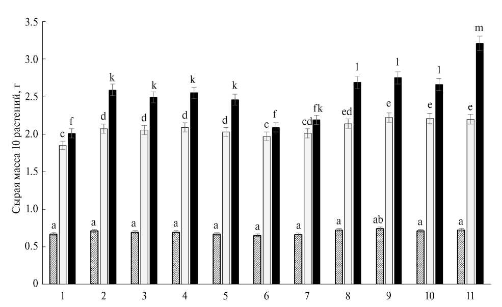 Рис. 2. Влияние 24-эпибрассинолида (ЭБ), 24-эпикастастерона (ЭК), феруловой кислоты (ФК) и их смесей на накопление сырой биомассы растениями яровой пшеницы. Снятие показателей проводили на 7 (столбики со штриховкой), 14 (светлые столбики) и 21 (черные столбики) сутки от начала обработки семян растворами веществ. 1 – контроль (вода); 2 – ЭБ, 10–9 М; 3 – ЭБ, 10–7 М; 4 – ЭК, 10–9 М; 5 – ЭК, 10–7 М; 6 – ФК, 10–9 М; 7 – ФК, 10–7 М; 8 – ЭБ+ФК, 10–9 М; 9 – ЭБ+ФК, 10–7 М; 10 – ЭК+ФК, 10–9 М; 11 – ЭК+ФК, 10–7 М. Достоверные различия на уровне P ≤ 0.05 отмечены разными буквами.