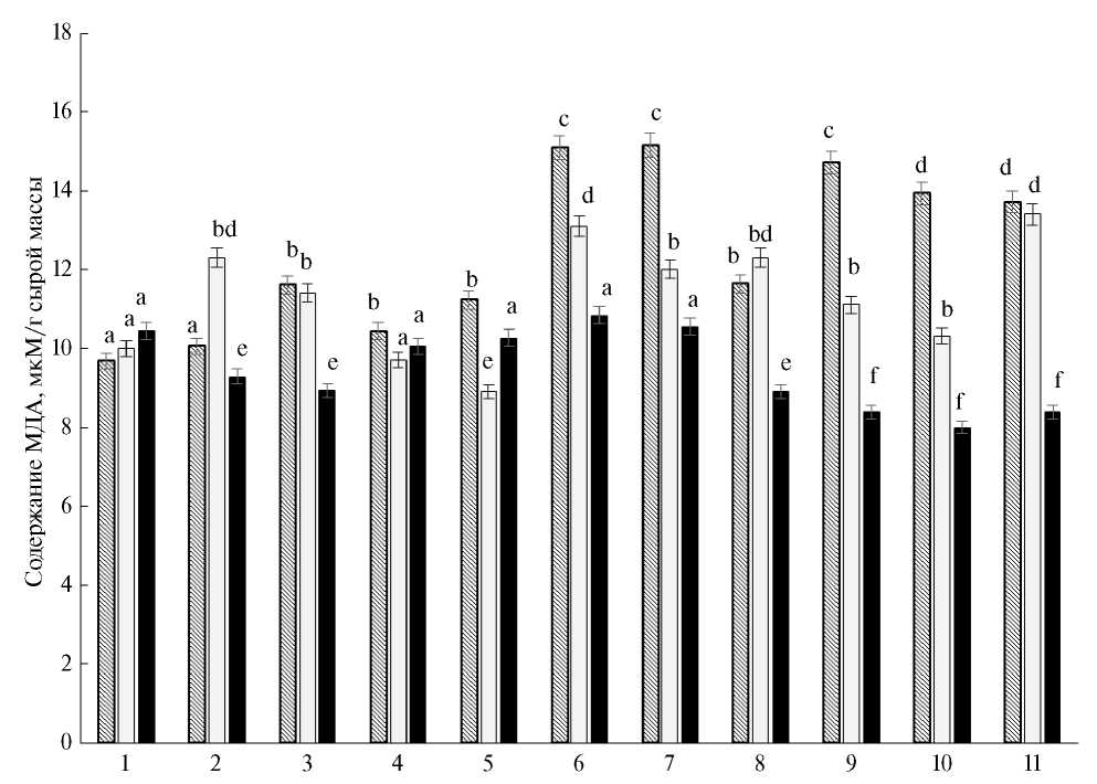 Рис. 3. Влияние 24-эпибрассинолида (ЭБ), 24-эпикастастерона (ЭК), феруловой кислоты (ФК) и их смесей на содержание малонового диальдегида в растениях яровой пшеницы на 7 (столбики со штриховкой), 14 (светлые столбики) и 21 (черные столбики) сутки от начала обработки семян растворами веществ. 1 – контроль (вода); 2 – ЭБ, 10–9 М; 3 – ЭБ, 10–7 М; 4 – ЭК, 10–9 М; 5 – ЭК, 10–7 М; 6 – ФК, 10–9 М; 7 – ФК, 10–7 М; 8 – ЭБ+ФК, 10–9 М; 9 – ЭБ+ФК, 10–7 М; 10 – ЭК+ФК, 10–9 М; 11 – ЭК+ФК, 10–7 М. Достоверные различия на уровне P ≤ 0.05 отмечены разными буквами.