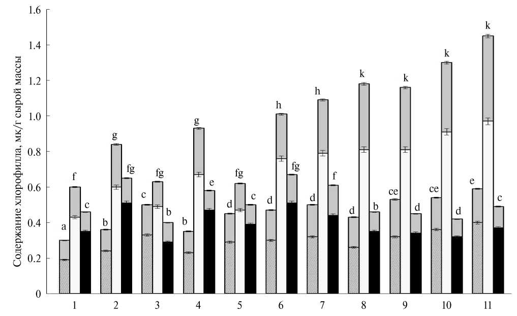 Рис. 4. Влияние 24-эпибрассинолида (ЭБ), 24-эпикастастерона (ЭК), феруловой кислоты (ФК) и их смесей на содержание хлорофилла в растениях яровой пшеницы на 7 (столбики со штриховкой), 14 (светлые столбики) и 21 (черные столбики) сутки от начала обработки семян растворами веществ. 1 – контроль (вода); 2 – ЭБ, 10–9 М; 3 – ЭБ, 10–7 М; 4 – ЭК, 10–9 М; 5 – ЭК, 10–7 М; 6 – ФК, 10–9 М; 7 – ФК, 10–7 М; 8 – ЭБ+ФК, 10–9 М; 9 – ЭБ+ФК, 10–7 М; 10 – ЭК+ФК, 10–9 М; 11 – ЭК+ФК, 10–7 М. Нижние столбики – хлорофилл а, верхние темно-серые столбики – хлорофилл b. Достоверные различия на уровне P ≤ 0.05 отмечены разными буквами.