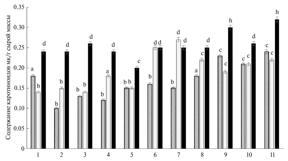 Рис. 5. Влияние 24-эпибрассинолида (ЭБ), 24-эпикастастерона (ЭК), феруловой кислоты (ФК) и их смесей на содержание каротиноидов в растениях яровой пшеницы на 7 (столбики со штриховкой), 14 (светлые столбики) и 21 (черные столбики) сутки от начала обработки растворами веществ. 1 – контроль (вода); 2 – ЭБ, 10–9 М; 3 – ЭБ, 10–7 М; 4 – ЭК, 10–9 М; 5 – ЭК, 10–7 М; 6 – ФК, 10–9 М; 7 – ФК, 10–7 М; 8 – ЭБ+ФК, 10–9 М; 9 – ЭБ+ФК, 10–7 М; 10 – ЭК+ФК, 10–9 М; 11 – ЭК+ФК, 10–7М. Достоверные различия на уровне P ≤ 0.05 отмечены разными буквами.