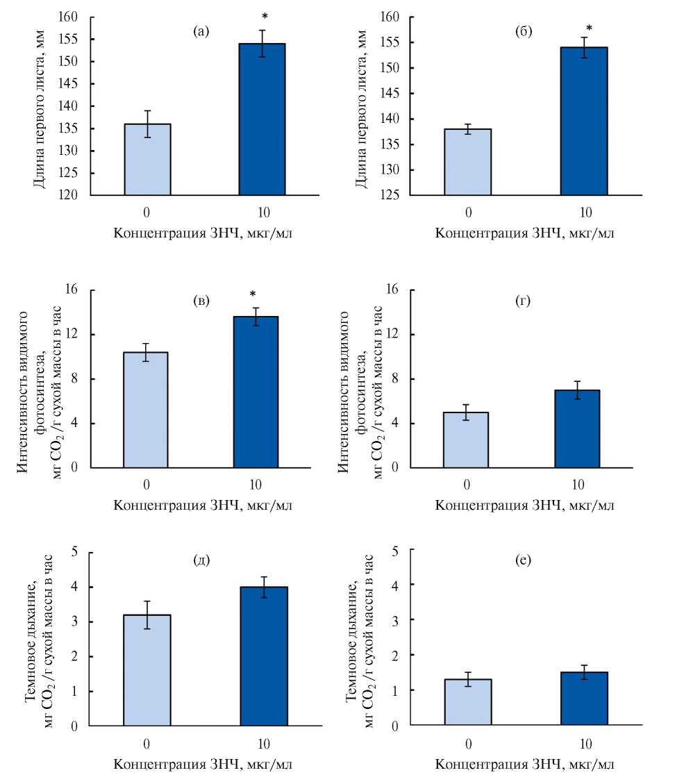 Рис. 4. Влияние золотых наночастиц (ЗНЧ) на ростовые параметры (а, б), интенсивность видимого фотосинтеза (в, г) и темнового дыхания (д, е) пшеницы до (а, в, д) и после (б, г, е) низкотемпературного закаливания (4°С, 7 сут). * – Статистически значимые при P < 0.05 отличия обработанных ЗНЧ растений от варианта 0 (необработанные растения).