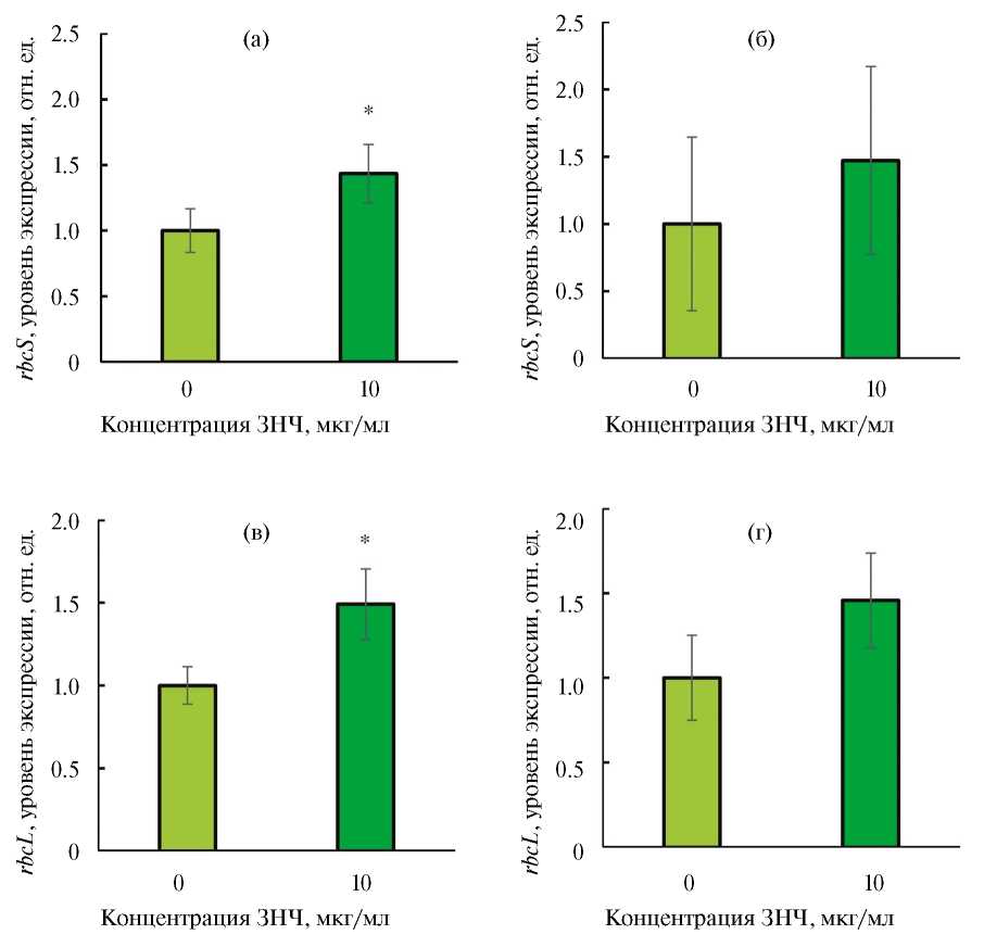 В ряде исследований отмечено увеличение интенсивности фотосинтеза и содержания хлорофиллов под влиянием ЗНЧ [6, 10, 11]. Установлено, что другие НЧ также изменяют интенсивность синтеза фотосинтетических пигментов и активность ФСА посредством регуляции экспрессии генов, задействованных в его работе. Например, НЧ оксида цинка повышали экспрессию генов, кодирующих структурные единицы фотосистем (PSAD2, PSAE2, PSAK) и генов синтеза фотосинтетических пигментов (CAO, CHLG, GGPS6, PSY, PDS, ZDS) [29]. НЧ оксида кремния усиливали экспрессию генов PsbH, PsbB и PsbD, кодирующих белки сборки ФС II [23]. НЧ оксида титана усиливали экспрессию генов, участвующих в синтезе РБФК/О [30].