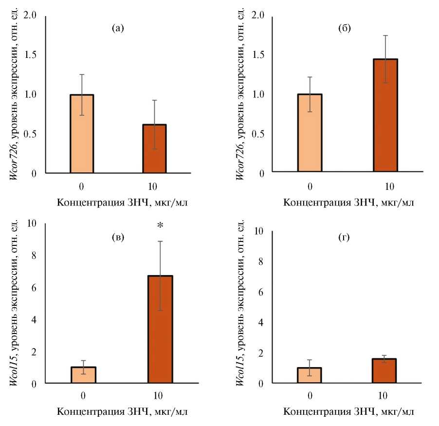 Нами проведена оценка влияния ЗНЧ на уровень экспрессии COR генов – Wcor726 и Wcor15, кодирующих защитные белки, играющие важную роль в формировании повышенной холодоустойчивости. Показано, что в листьях незакаленных растений уровень экспрессии гена Wcor15 под влиянием ЗНЧ повышался в 8 раз (рис. 6в), тогда как уровень экспрессия гена Wcor726 не изменялся (рис. 6а). В условиях низкотемпературного закаливания обработка ЗНЧ не влияла на уровень экспрессии изученных генов (рис. 6б, г).
