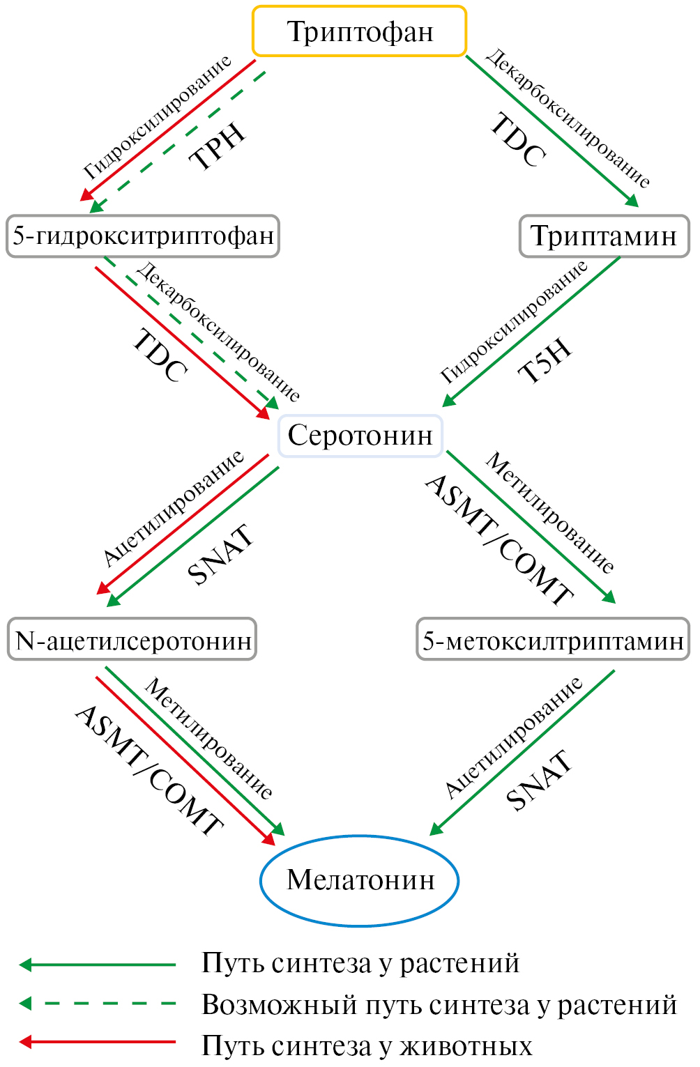 Предшественником мелатонина как у животных, так и у растений является триптофан [18]. Сравнение синтеза мелатонина у животных и ФМТ у растений анализируется в статье [19]. Синтез ФМТ у растений более сложный, чем синтез мелатонина у животных, и, кроме того, растения могут производить больше мелатонина, чем животные.