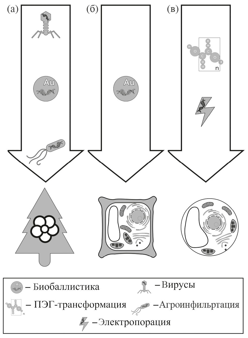 Рис. 1. Растительные системы, используемые для транзиентной экспрессии и их доставка в растительные клетки: (а) – интактные растения, изолированные органы или специализированные ткани растений, основные способы доставки – агроинфильтрация, вирусные частицы, биобаллистика; (б) – каллус, суспензионные культуры растительных клеток, основные способы доставки – биобаллистика; (в) – протопласты растительных клеток, основные способы доставки – электропорация.