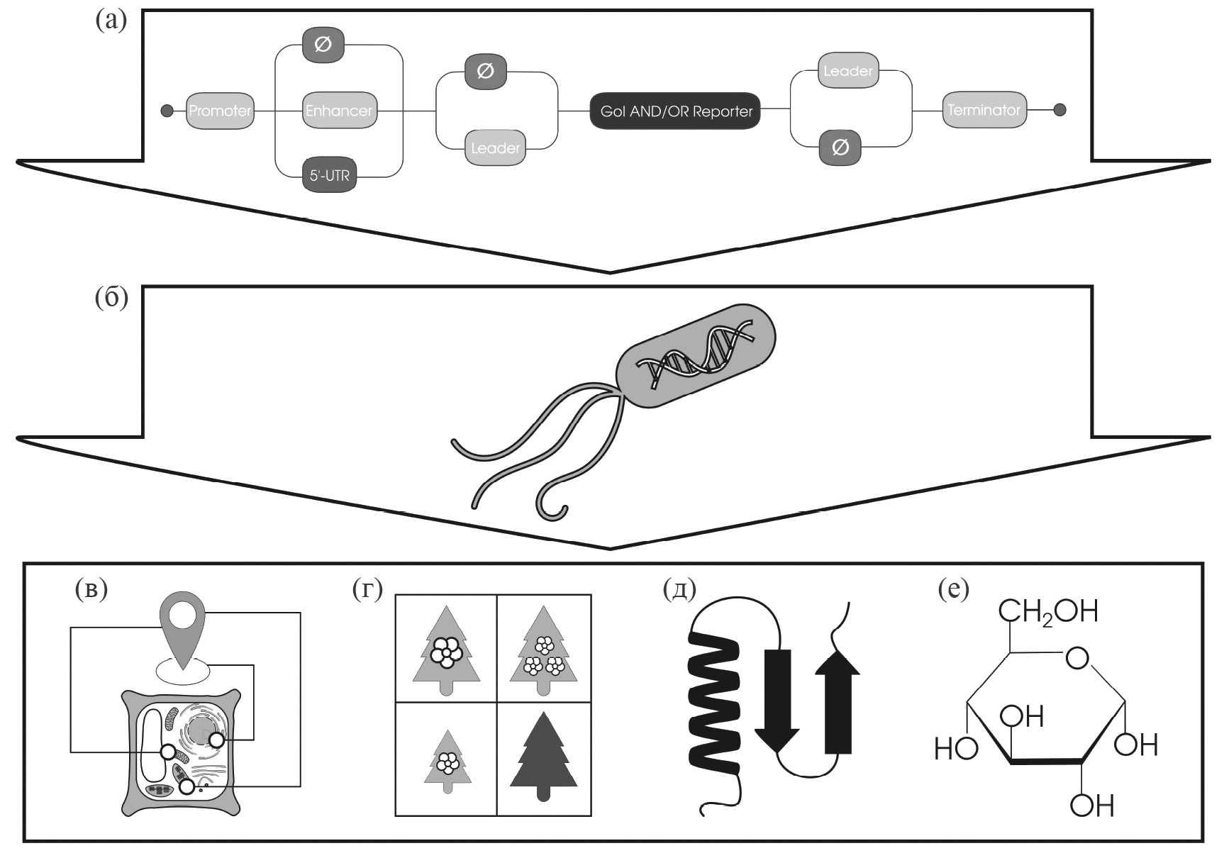 Рис. 2. Схема генных конструкций Т-ДНК для различных аспектов изучения продуктов гена в растительной клетке: (а) – общая схема Т-ДНК области, включающая промотор и терминатор (Promoter, Terminator – обязательные составляющие); энхансер (Enhancer, клонируется при тестировании функциональной активности последовательностей); лидерный сигнал (Leader, клонируется при изучении локализации генного продукта в растительной клетке); целевой ген и/или репортерный ген (Goi and/or Reporter – целевой ген клонируется при изучении функциональной роли генного продукта целевого гена; транскрипционно-трансляционное слияние целевого гена с репортерным геном используется при изучении локализации генного продукта в растительной клетке, а также в исследованиях белок-белкового взаимодействия; репортерный ген используется при тестировании функциональной активности последовательностей); (б) – генными конструкциями трансформируют агробактерии, которые используют при транзиентной экспрессии для (в) изучения локализации генного продукта в растительной клетке; (г) – оценки фенотипа растений при изучении функциональной роли генного продукта целевого гена; (д) – исследовании свойств белкового продукта целевого гена, включая активности целевого белка, белок-белковые взаимодействия и др.; (е) для тестирования продуктов его функционирования с целью прояснение механизмов регуляции сложных метаболических путей.