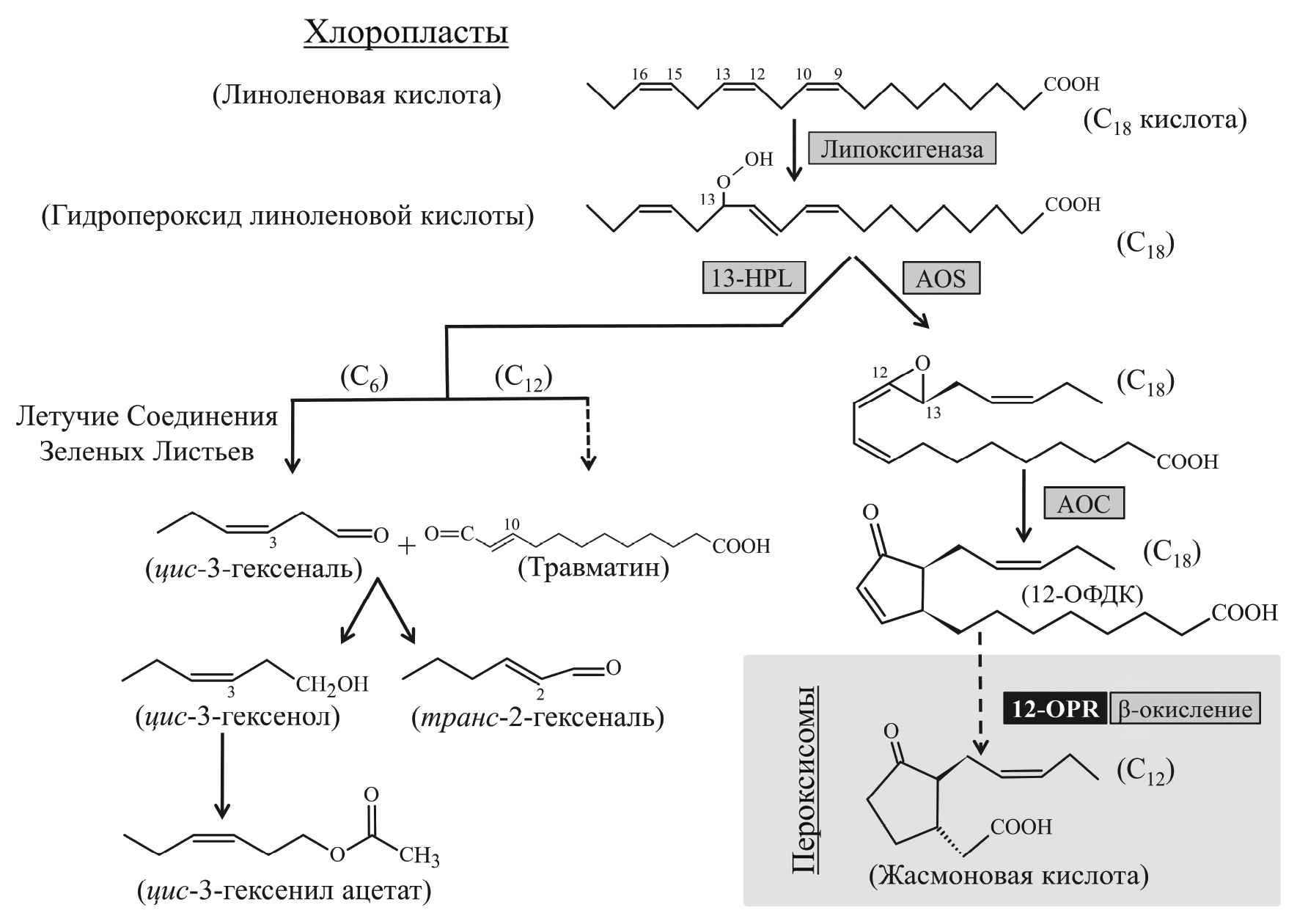 В AOS ветви в результате совместного действия AOS и алленоксидциклазы образуется 12-оксофитодиеновая кислота, которая далее превращается в жасмоновую кислоту в пероксисомах в результате действия 12-оксофитодиеноатредуктазы (OPR) и трех циклов β-окисления. Гидропероксидлиазы катализируют изомеризацию гидропероксидов жирных кислот в нестабильные промежуточные продукты – полуацетали, которые далее спонтанно распадаются на два фрагмента. При участии 13-HPL из 13-ГПОТ образуются 12-углеродная альдокислота и шестиуглеродные альдегиды и их производные, такие как цис-3-гексеналь, транс-2-гексеналь, цис-3-гексенол и цис-3-гексенил ацетат [18]. Нестабильное 12-углеродное соединение ветви HPL, 12-оксо-9(Z)-додеценовая кислота, изомеризуется в более стабильную 12-оксо-10(E)-додеценовую кислоту, называемую травматином, а дальнейшее окисление альдегидной группы травматина приводит к образованию 2(Е)-додецен-1,12-дикарбоновой кислоты (травматиновой кислоты) [19]. Первый шестиуглеродный продукт ветви, цис-3-гексеналь, превращается в транс-2-гексеналь с участием изомеразы [20]. Альдегиды могут быть восстановлены до спирта [21], а спирты далее ацетилированы [22]. Существует мнение, что альдегиды формируются в поврежденных тканях, а затем диффундируют в интактные клетки, поэтому для образования соответствующих спиртов и ацилпроизводных необходимо присутствие интактных клеток рядом с поврежденным участком [23]. Метаболиты HPL и AOS ветвей, имеющие общие начальные стадии биосинтеза и образующиеся из одного субстрата, выполняют разные биологические функции [24].