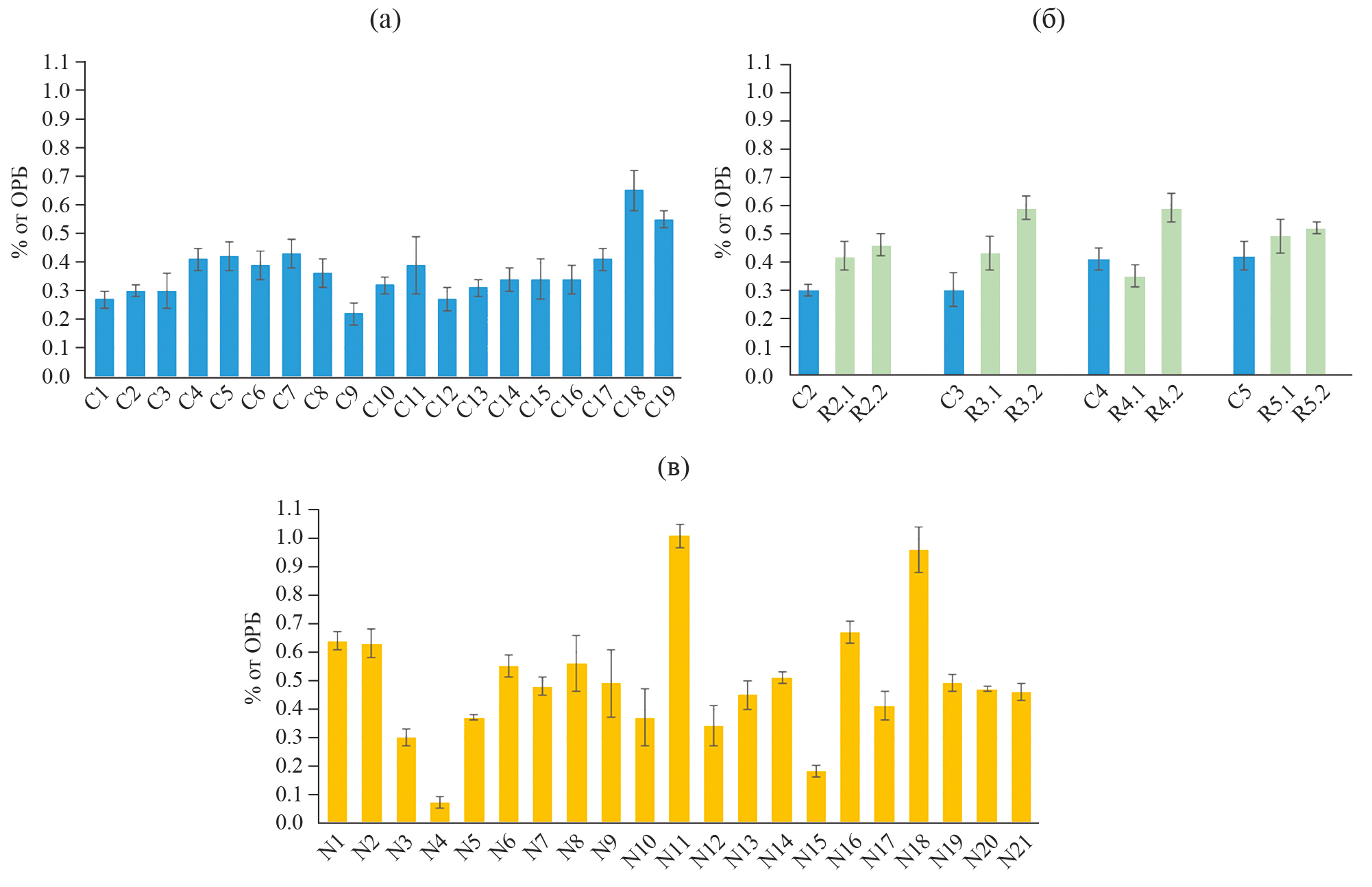 В реакцию мультиплексной ПЦР в реальном времени брали 1 мкл раствора ДНК или кДНК и амплифицировали в 20 мкл реакционной смеси следующего состава: 50 мМ Tris-SO4, pH 9.0, 30 мМ KCl, 10 мМ сульфата аммония, 0.01% Tween-20, 3 мМ MgCl2, 0.2 мМ смеси дезоксирибонуклеозидтрифосфатов, смесь праймеров и зонда по 0.4 мкМ каждого и 0.1 е.а./мкл Hot Start ДНК-полимеразы (“СибЭнзим”, Россия). Структура праймеров и зондов приведены в табл. 4 (Дополнительные материалы, табл. 4). Программа амплификации: 95°С – 3 мин., далее 40 циклов с детекцией на стадии отжига (каналы FAM, HEX, ROX): 95°С – 10 с, 60°С – 20 с. Каждый образец амплифицировали в трех повторах. Уровень экспрессии оценивали при помощи ПО “Bio-Rad CFX Manager 3.1”.