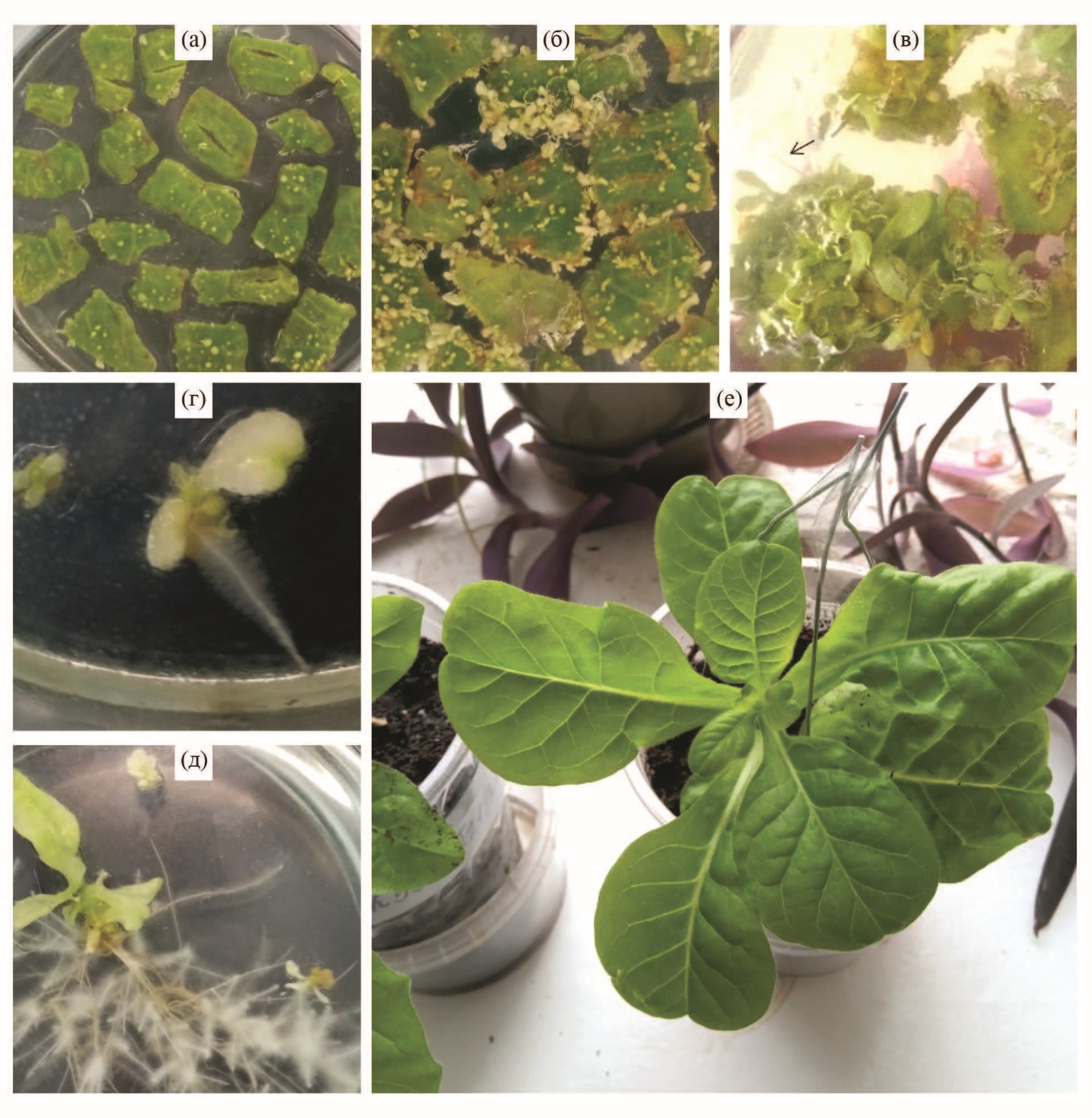 Рис. 1. Результаты трансформации листовых эксплантов табака rol-генами штамма К599 A. rhizogenes: (а) – образование на поверхности эксплантов точек регенерации на 7-й день после инокуляции, (б) – регенерация побегов на 14-й день после инокуляции, (в) – образование волосовидных корней на 25-й день после инокуляции (отмечено стрелкой), (г), (д) – регенерация корней из побегов на безгормональной среде, (е) – акклиматизация регенеранта к условиям почвы.