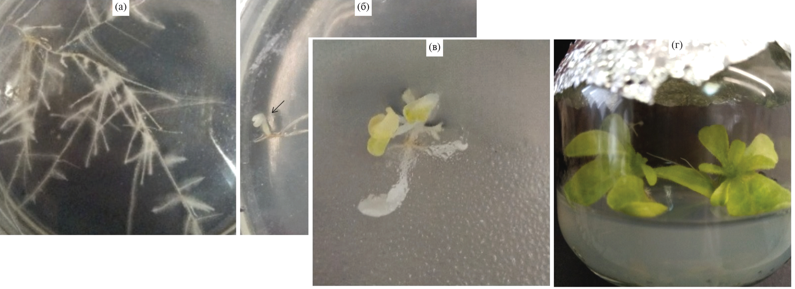 Рис. 2. Результаты трансформации листовых эксплантов табака rol-генами штамма А4 A. rhizogenes: (а) – внешний вид волосовидных корней на 14 день культивирования на среде без фитогормонов, (б), (в) – регенерация побега из волосовидного корня на среде с добавление БАП и НУК, (г) – культивирование регенерантов на среде с добавление БАП и НУК.